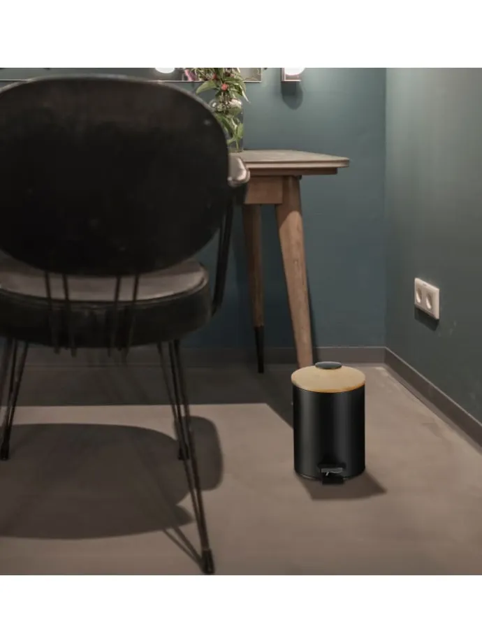In dem runden Müllbehälter mit Bambusdeckel kannst Du hygienisch und komfortabel Deine Abfälle im Bad oder am Schminktisch entsorgen. Mit dem rutschfesten Trittpedal lässt sich der Badkübel freihändig öffnen. Das Schließen des Deckels gelingt dank Soft-Close-Funktion besonders sanft und leise. Der entnehmbare Kunststoffeimer sorgt für ein leichtes Entleeren des Abfalleimers. Zudem setzt der schicke Materialmix aus mattem Eisen und Bambus moderne Akzente in Deinem Badezimmer.