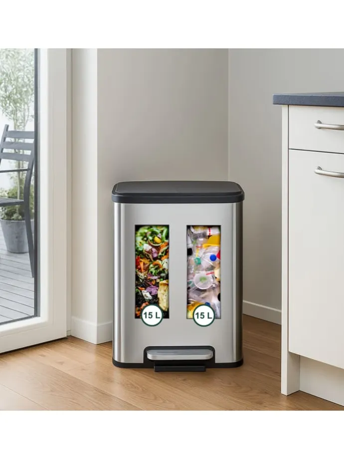 Mülltrennung war noch nie so einfach. Halte ein Zuhause sauber und hygienisch mit dem modernen Duo-Trenneimer. Haushalts- und Küchenabfälle kannst Du dank des Trittpedals freihändig entsorgen. Die Absenkautomatik sorgt dafür, dass sich der Deckel des Abfallbehälters sanft und geräuschlos schließt. Die entnehmbaren Kunststoffinneneimer mit praktischen Henkeln ermöglichen ein leichtes Entleeren des Mülltrennsystems. Optisch begeistert der Küchenmülleimer mit seinem modernen Design.