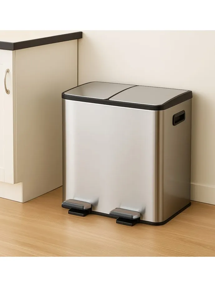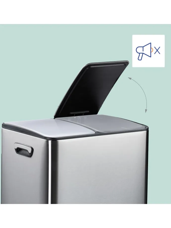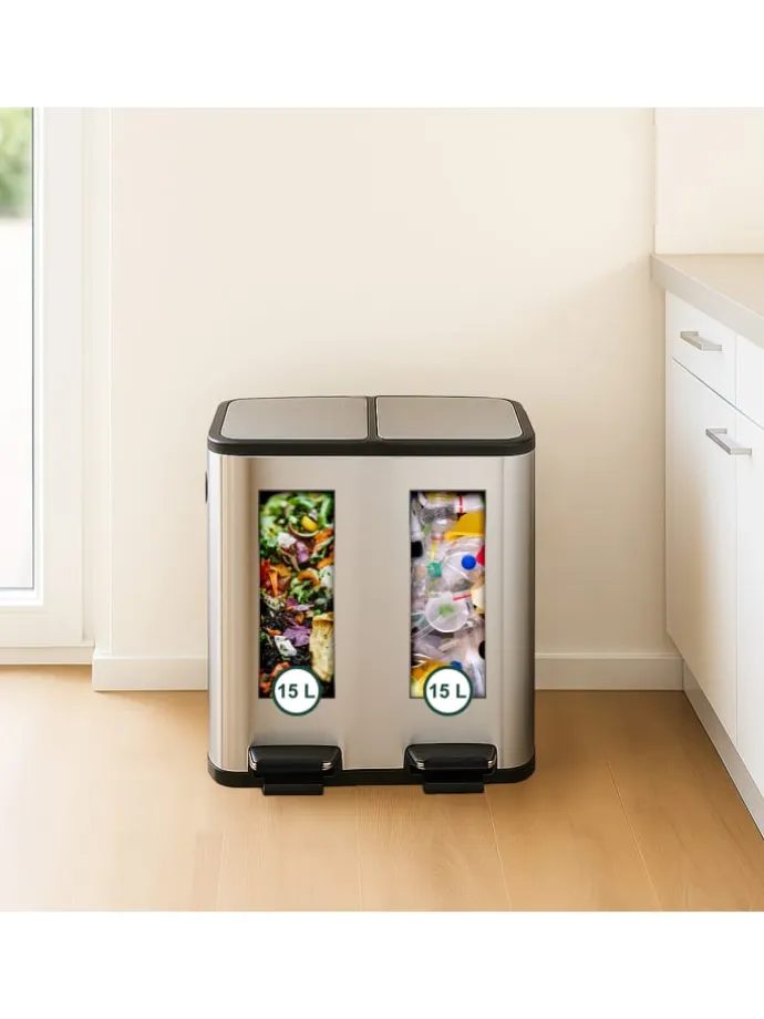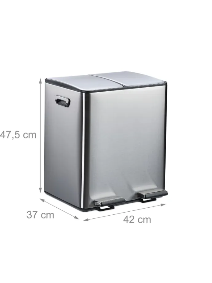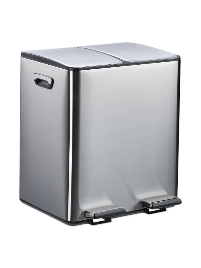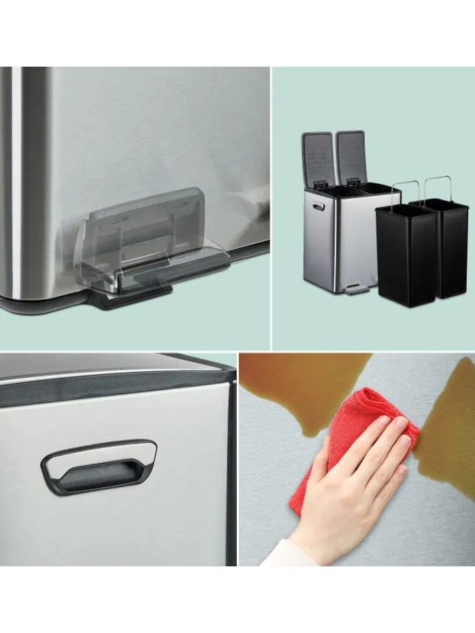 Entsorge Deine Abfälle in der Küche oder dem Büro hygienisch in diesem Treteimer. Dank seiner 2 Fächer eignet sich der Abfalleimer hervorragend für Papier-, Plastik- oder Restmüll. Mit dem praktischen Trittpedal lässt sich der Kücheneimer ohne lästiges Bücken bequem öffnen. Die Deckel schließen dank Soft-Close-Funktion leise und sanft. Der Mülleimer aus pulverbeschichtetem Eisen ist robust und begeistert durch sein modernes Design mit abgerundeten Ecken.