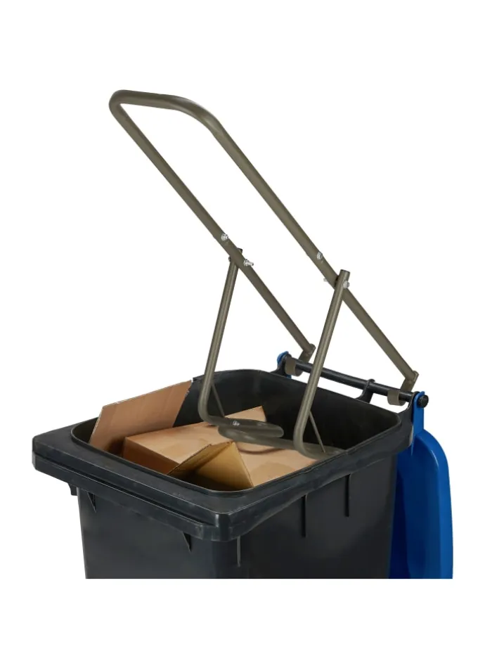 Mit dieser manuellen Hausmüllpresse aus Stahl kannst Du das Volumen von Restmüll, Plastik, Papier und Co. in der Abfalltonne ganz einfach reduzieren. Deine Mülltonne muss dadurch seltener geleert werden und Du sparst einen erheblichen Teil Deiner Abfallgebühren. Häng den praktischen Müllstampfer dafür einfach an den Scharnieren der Mülltonne ein und drücke den Hebel langsam nach unten. So wird Dein Müll komprimiert und in der Tonne ist wieder Luft für weiteren Abfall.