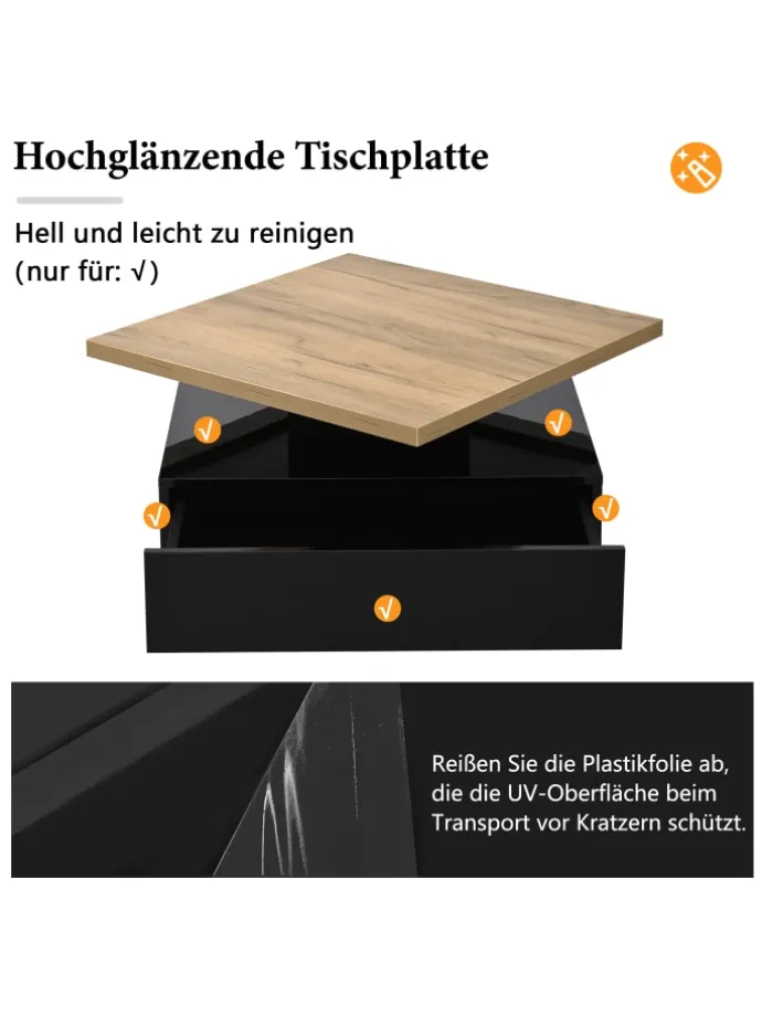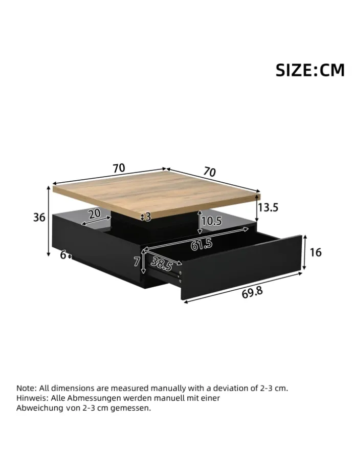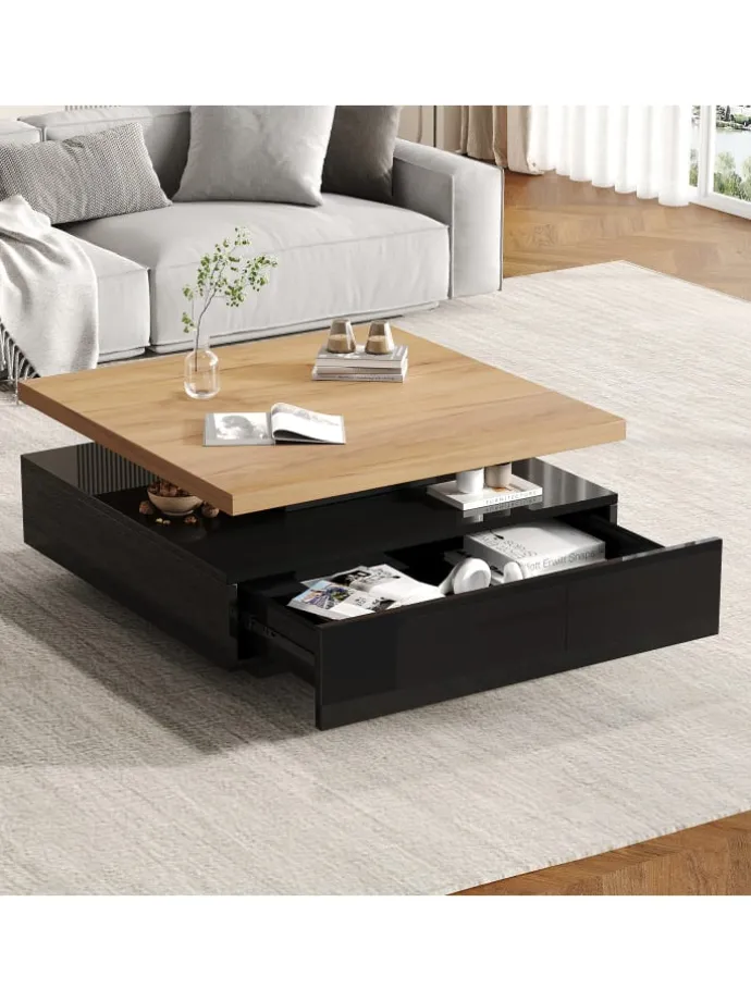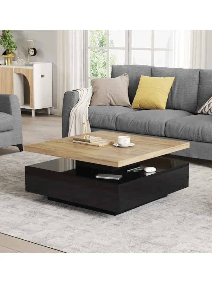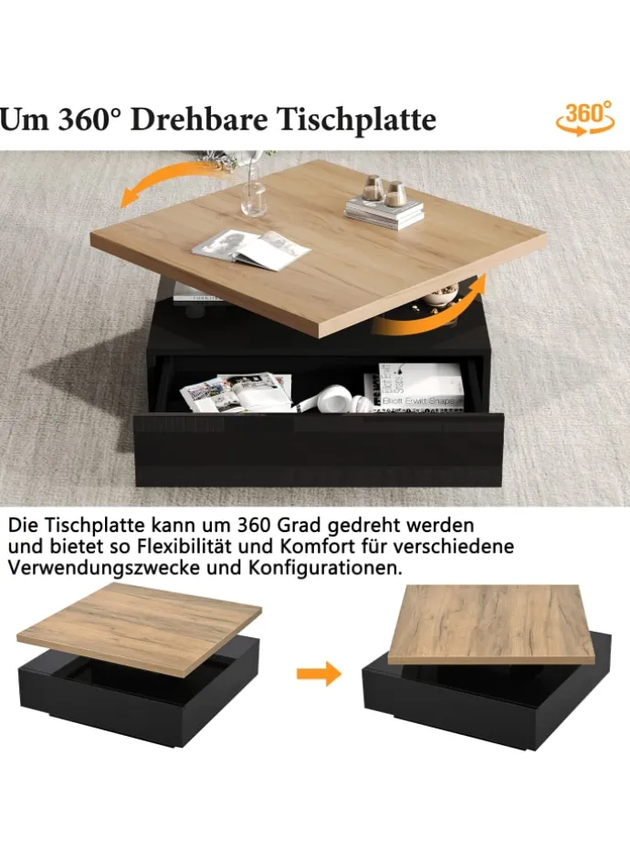 Dieser elegante quadratische Couchtisch vereint durchdachtes Design mit praktischer Funktionalität. Seine 360° drehbare Tischplatte ermöglicht flexible Nutzung und schafft mehr Platz für Dekoration, Bücher oder Getränke.