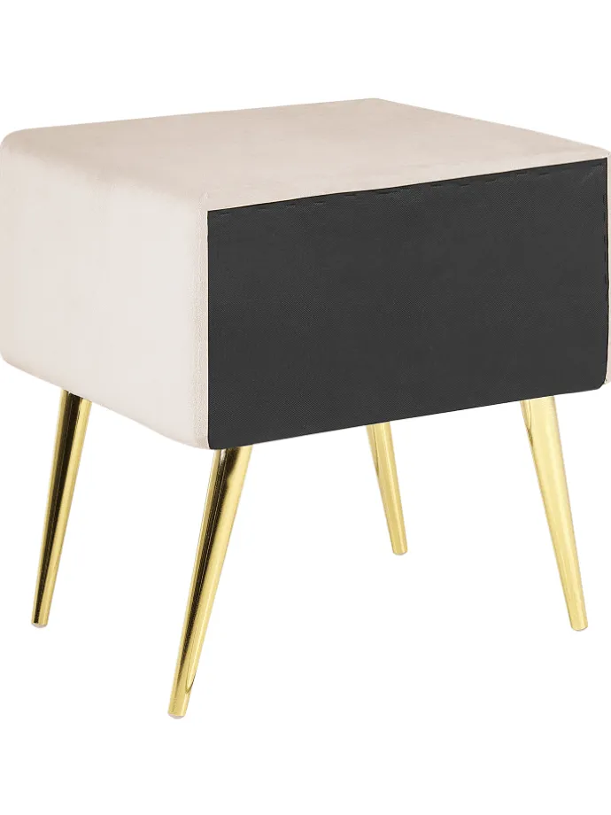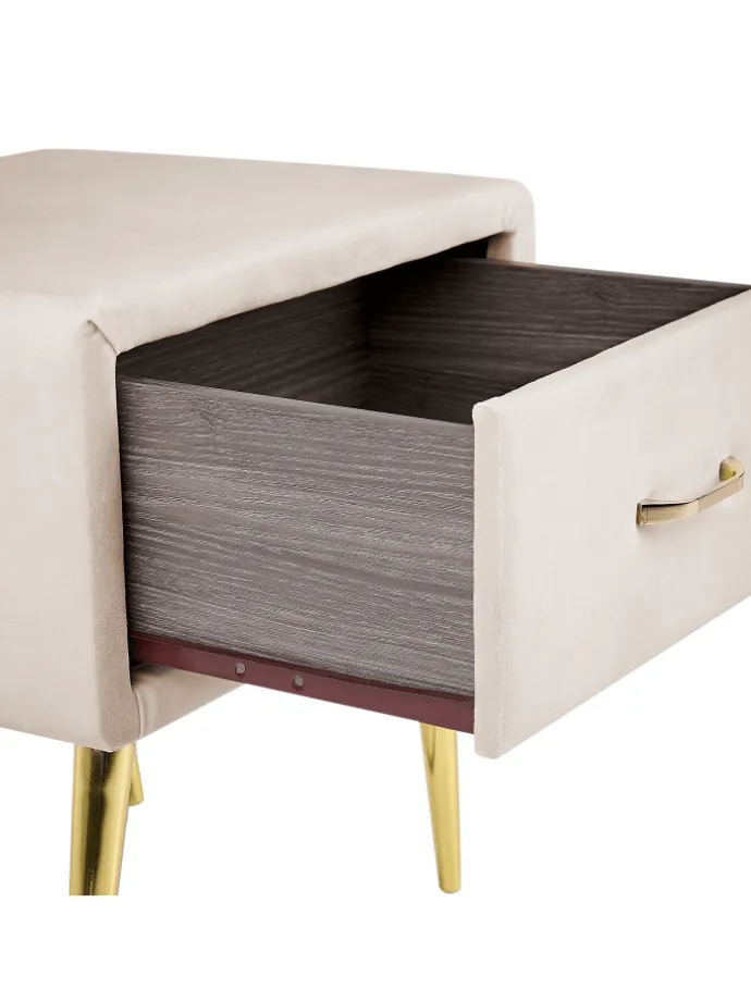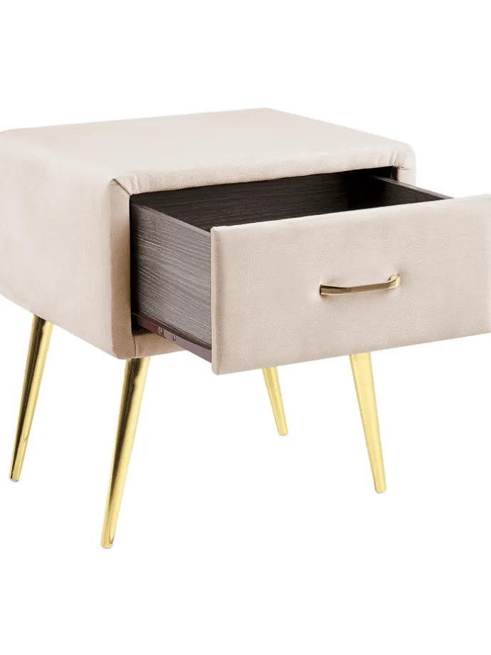 Moderner Samt-Nachttisch mit 1 Schublade und goldenen Metallbeinen. Dieser Nachtschrank ist mit seiner eleganten Gestaltung eine hervorragende Ergänzung zu Ihrer Einrichtung. Gefertigt aus widerstandsfähigem Holz, bezogen mit edlem hochwertigem Samt strahlt er gemütliche Behaglichkeit aus. Die leichtgängige Schublade mit dekorativem Griff in Roségold bietet Ihnen genügend Platz, um kleine Gegenstände diskret und griffbereit zu verstauen. Die schmalen, abgeschrägten Beine geben Stabilität und unterstreichen das moderne Design. Nutzen Sie das vielseitige Schränkchen als Nachttisch im Schlafzimmer, als Beistelltisch im Wohnzimmer, oder auch als kleines Schränkchen im Eingangsbereich.