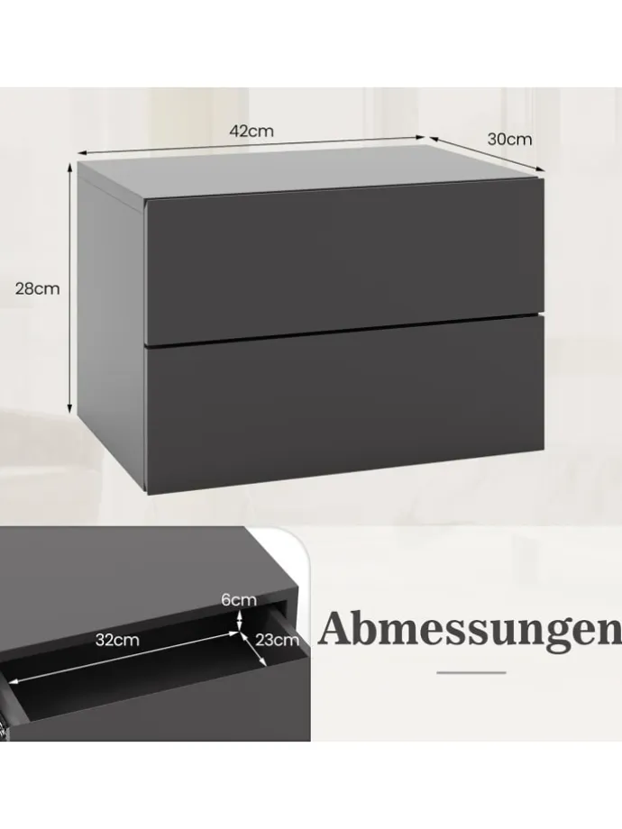 Dieser Nachttisch kann in beliebiger Höhe aufgehängt werden und schafft so wertvollen Platz auf dem Boden. Zusätzlich sind die enthaltenen wandmontierten Befestigungssätze speziell für massive Ziegelwände ausgelegt, um eine sichere und stabile Installation zu gewährleisten. Die Kombination aus breiter Ablagefläche und 2 Schubladen bietet geordneten Stauraum für Ihre nächtlichen Essentials. Mit einzigartigen Holzmaserungstexturen und klaren Linien fügt sich dieser Nachttisch mit 2 Schubladen nahtlos in verschiedene Wohnstile ein. Geeignet für das Schlafzimmer, Wohnzimmer oder Arbeitszimmer, bietet dieser wandmontierte Nachttisch Vielseitigkeit und ästhetischen Reiz.
