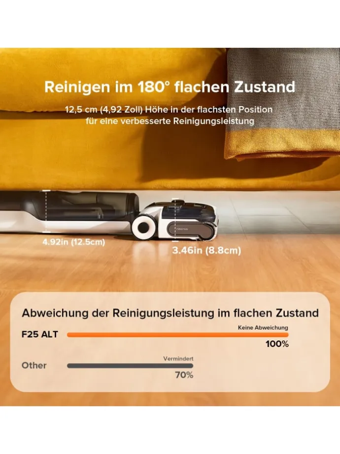 Mit nur 12,5 cm Höhe erreicht der F25 ALT mühelos jeden Winkel – selbst unter Möbeln – ohne Saugkraftverlust.