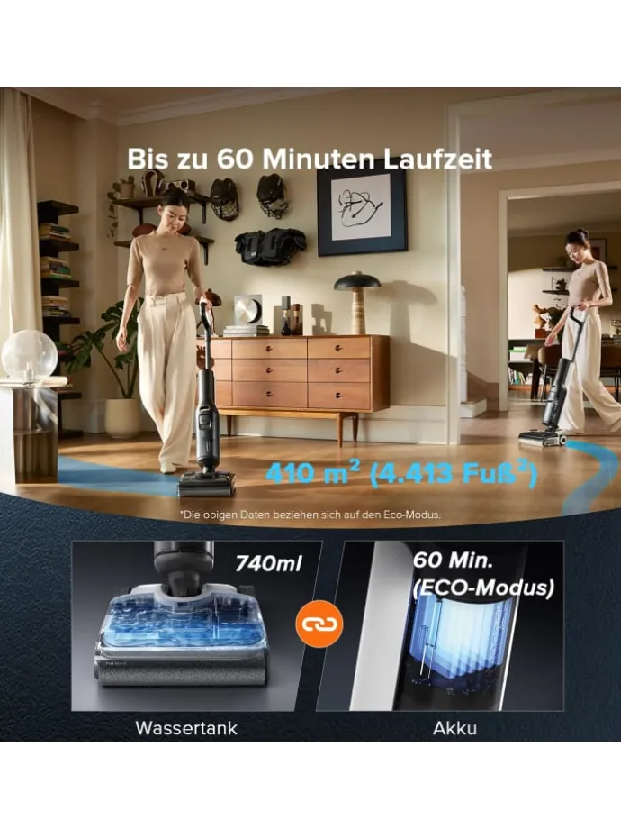 Die dreimal längere Akkulaufzeit im Vergleich zu herkömmlichen zylindrischen Batterien ermöglicht bis zu 60 Minuten ununterbrochene Reinigung (ECO-Modus) – ideal für Flächen bis zu 410 m².