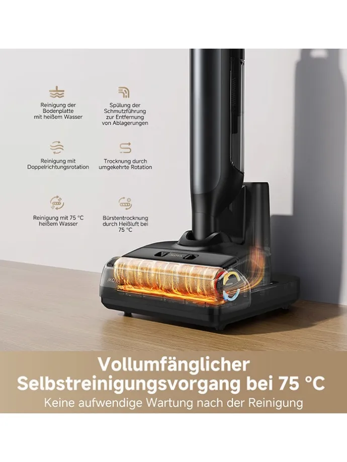 – automatische Selbstreinigung: Bürsten werden mit 75 °C heißem Wasser gereinigt; anschließend trocknet das Gerät via Heißluft in nur 5 Minuten