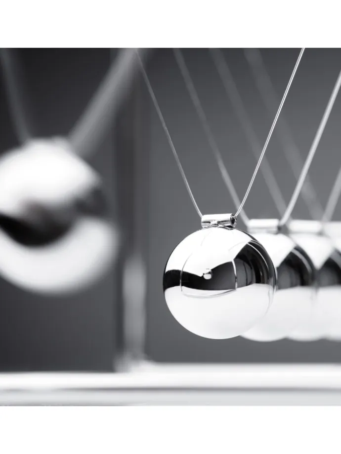 Das klassische Newton Pendel ist ein zeitloses und zugleich dekoratives Objekt für Ihr Büro oder den Schreibtisch. Die Funktionsweise des Kugelstoßpendels ist simpel und dennoch faszinierend: Lenken Sie eine oder mehrere der äußeren Kugeln aus – sobald sie an die ruhenden Kugeln stoßen, fängt auf der Gegenseite die gleiche Anzahl Kugeln an zu schwingen. Damit vereint Newtons Wiege Physik und Kunst auf spannende Weise und gibt interessante Einblicke in das Gesetz der Impulserhaltung.