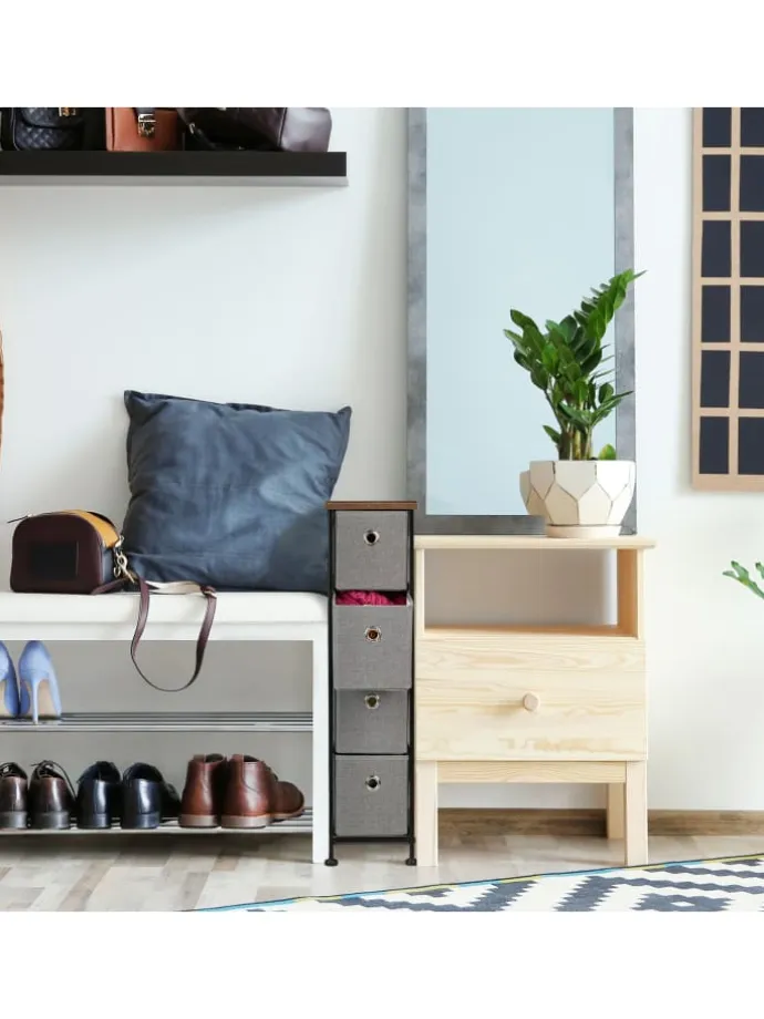 Der Schubladenschrank ist das perfekte Möbelstück für Wohn-, Schlaf-, Arbeitszimmer oder Flur, um auch in engen Nischen und Ecken praktischen Stauraum zu schaffen. Das schmale Nischenregal bietet dank der 4 Schubladen ausreichend Platz zur staubfreien Aufbewahrung von Kleidung, Accessoires und anderen Kleinteilen. Das Industrial-Design des Nischenschranks ist dabei ein Blickfang in Deinem Zuhause. Die verstellbaren Füße sorgen für einen festen Stand der Kommode.
