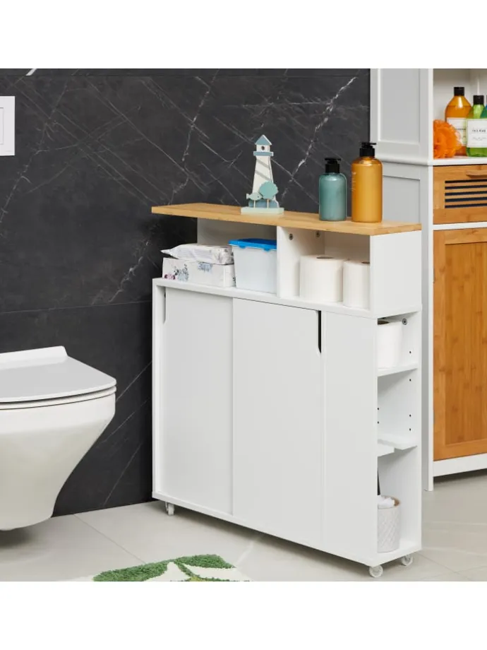 Der Rollwagen ist das perfekte Möbelstück für das Bad, um auch in engen Nischen und Ecken Stauraum zu schaffen. Mit 6 Fächern bietet das schmale Regal ausreichend Platz für Kosmetika, Putzmittel, und andere Badutensilien. Die Toilettenbürste passt in den seitlichen Halter. Die 3 verstellbaren Einlegeböden sorgen für eine flexibel Gestaltung der Fächer. Optisch überzeugt der rollbare Nischenschrank mit dem weißen Design und der natürlichen Bambusablage.