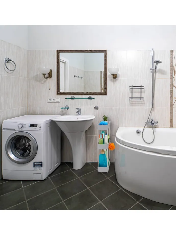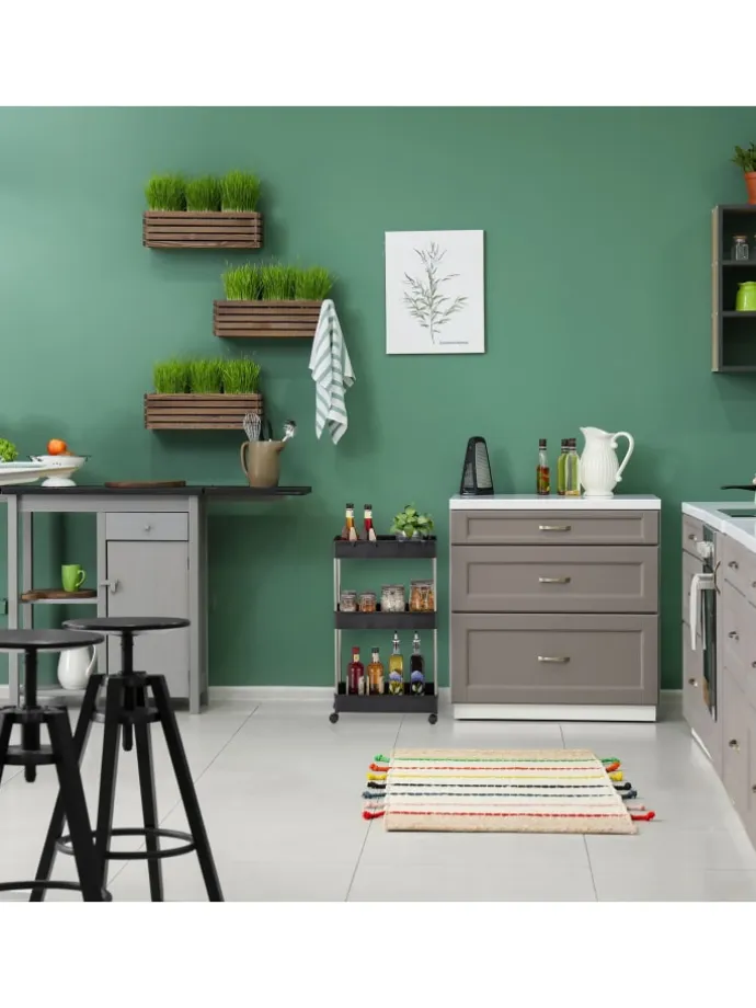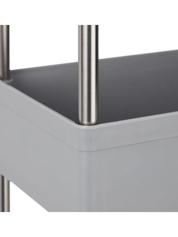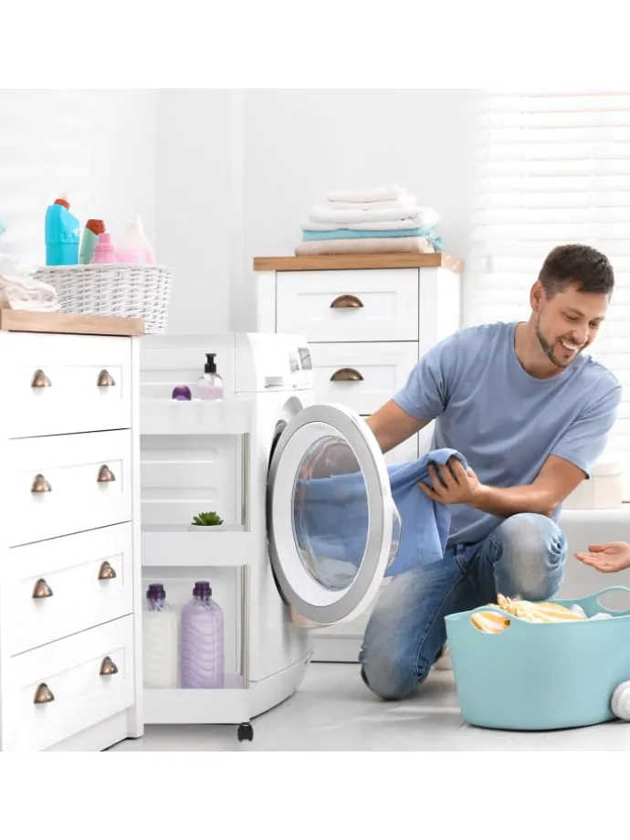 Der Rollwagen ist das perfekte Möbelstück für Bad oder Küche, um auch in engen Nischen und Ecken praktischen Stauraum zu schaffen. Mit 3 Ablagen bietet das schmale Schieberegal ausreichend Platz für Badutensilien, Küchenzubehör und andere Dinge des Alltags, an den 4 Haken lassen sich Hand- und Geschirrtücher aufhängen. Dank des offenen Designs und der 4 Rollen lässt sich der Nischenrollwagen bequem hin und her schieben und Du hast die verstauten Utensilien sofort griffbereit.