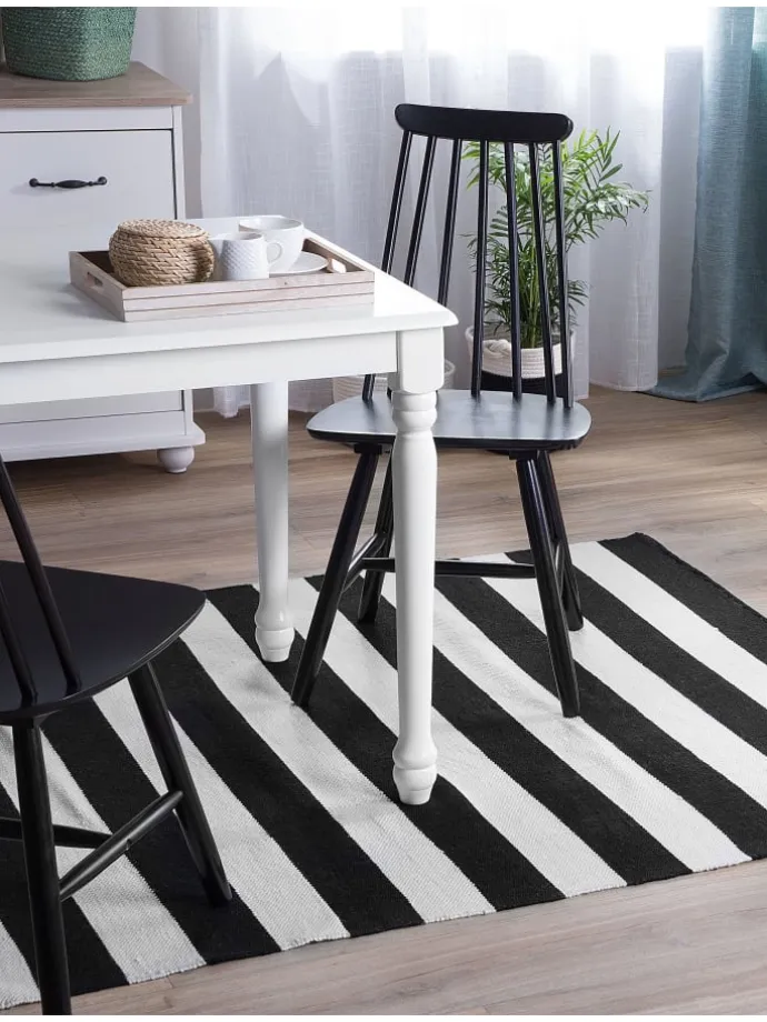 Robuster Outdoor Teppich mit schwarz-weißen Streifen. Speziell für den Außenbereich geeignet ist dieser Teppich mit schwarz-weißen Streifen. Das Material aus Kunstfasern lässt Feuchtigkeit schnell trocknen, was den Teppich besonders praktikabel in der Reinigung macht. Ihre Terrasse oder Ihr Balkon bekommen mit diesem praktischen Accessoire ein besonderes Highlight.