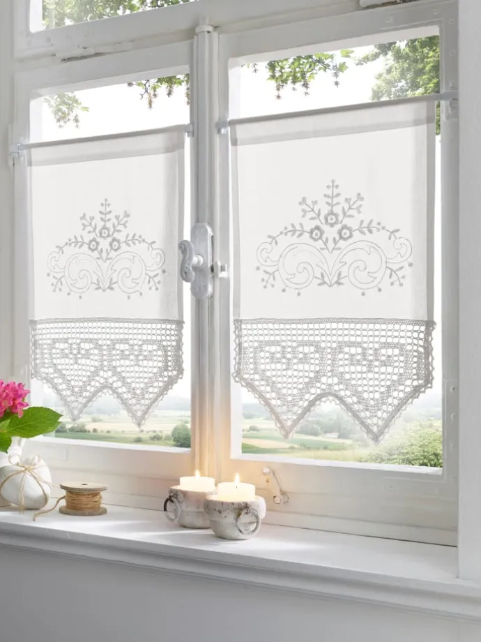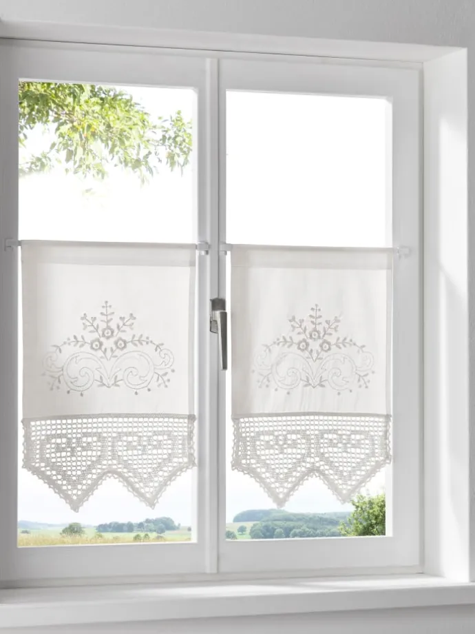 Panneau Halbtransparente Ware mit aufwendiger Stickerei und Häkel-Abschluss. Tunnel für die Gardinenstange.