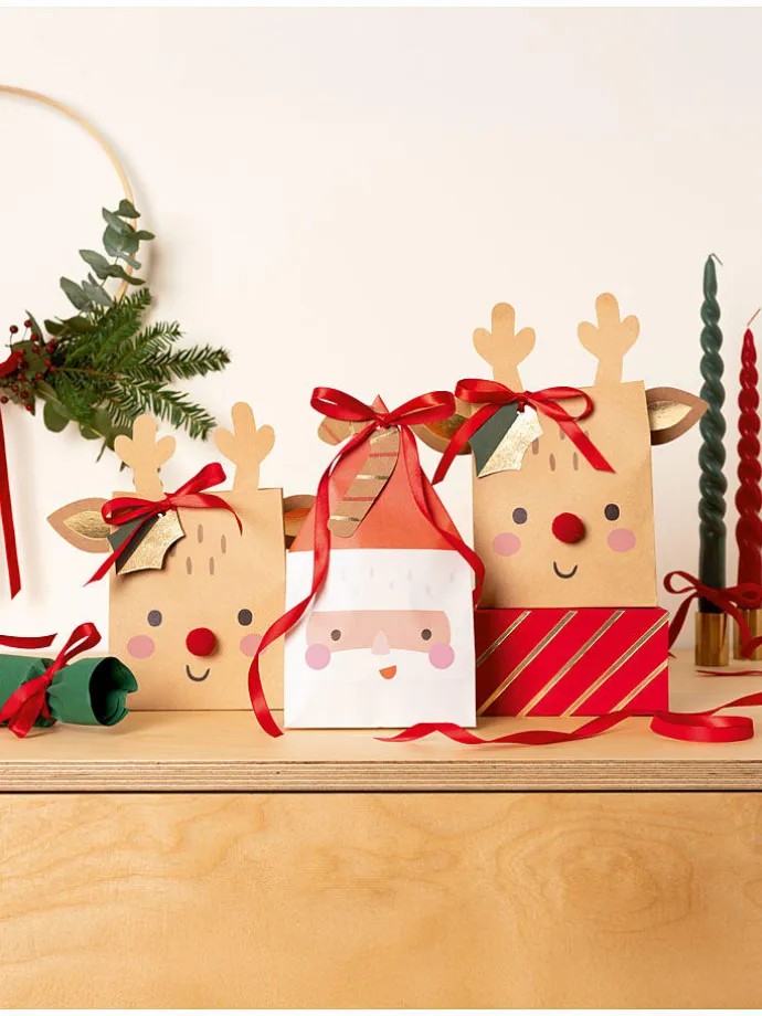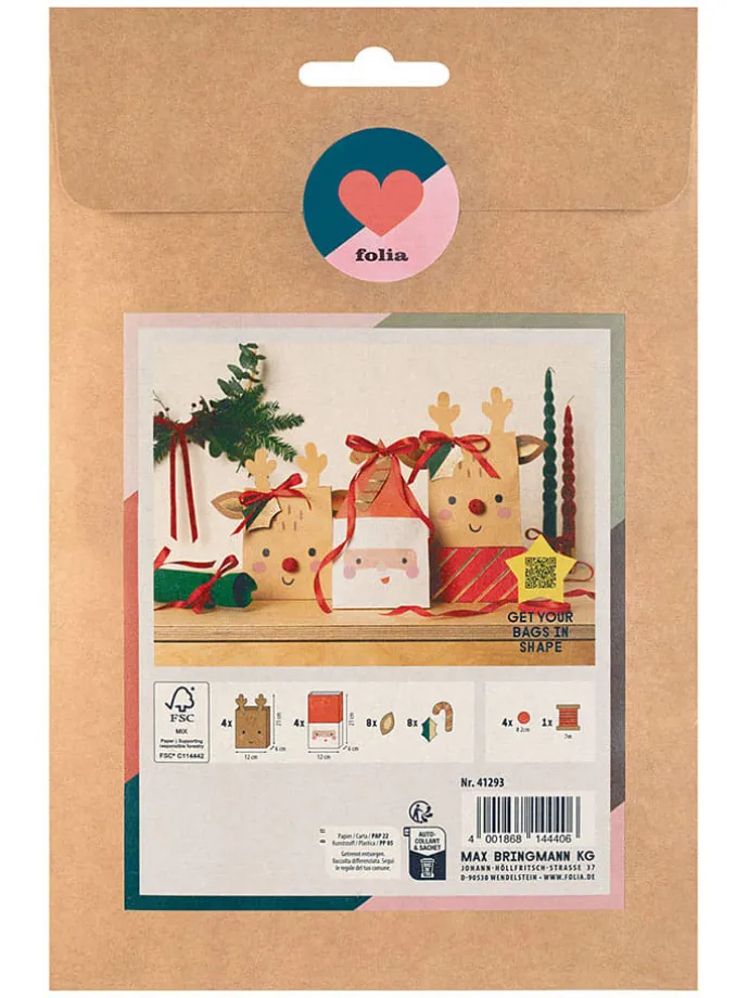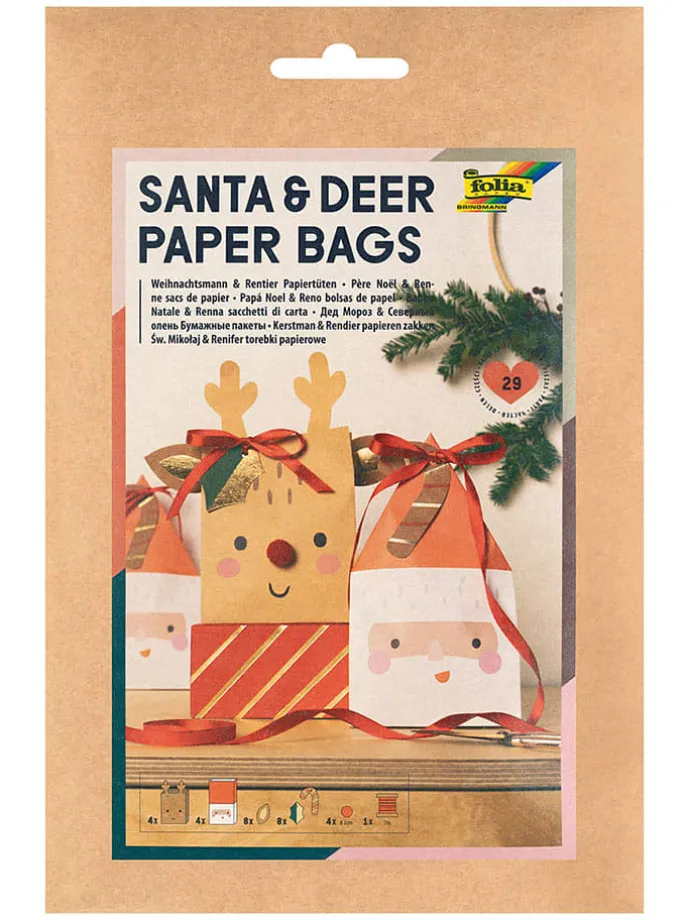 – Inhalt: 4 Papiertüten Rentier, 4 Papiertüten Weihnachtsmann, 16 vorgetanzte Motiv, 4 Pompons, 1 Satinband