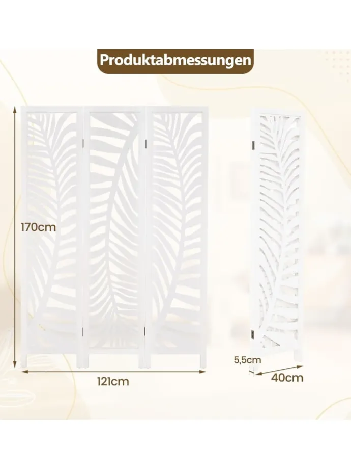 Möchten Sie Ihrem Raum Stil und Privatsphäre verleihen? Dieser elegante 3-teilige Raumteiler besticht durch wunderschöne Blattmuster, die jeden Raum verschönern und sofort für Abgrenzung in Schlafzimmern, Büros oder Wohnbereichen sorgen. Einfach aufklappen und in Sekundenschnelle ohne Werkzeug aufstellen. Bei Nichtgebrauch lässt er sich flach zusammenfalten und leicht verstauen. Hergestellt aus natürlichem Paulownia-Holz und hochwertigen MDF-Platten ist er leicht und dennoch robust.
