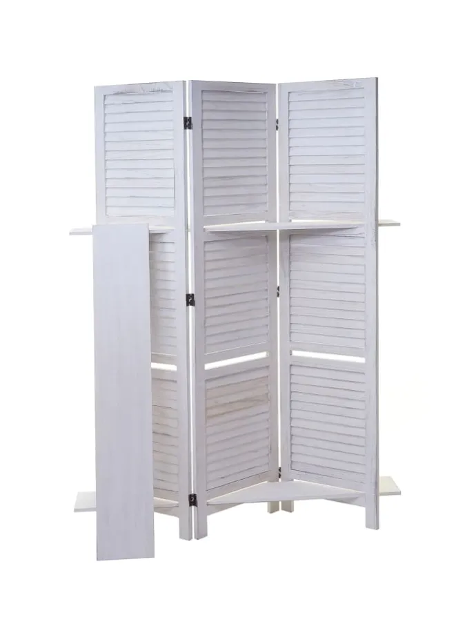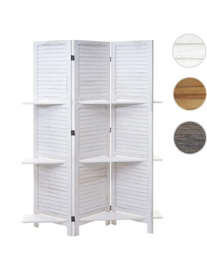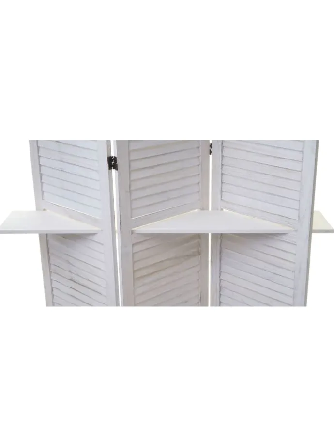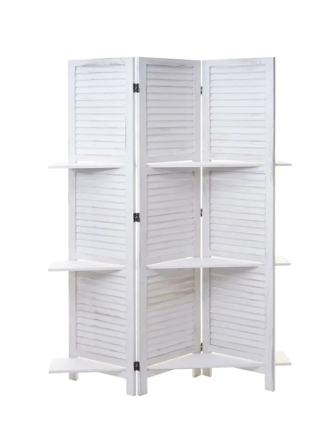 Dieser zeitlose Paravent ist ein echter Hingucker! Doch man sieht nur hin, nicht durch – wäre ja auch blöd sonst. Somit eignet er sich hervorrragend als Raumtrenner, ganz egal ob Sie ihn im Eingangsbereich, im Wohnzimmer, im Schlafzimmer oder im Kinderzimmer platzieren! Die drei Regalböden werden durch die Flügel durchgeschoben. In den so entstandenen Ecken können Bücher oder Dekoartikel gestellt werden. Das lockert die Optik auf und schafft Blickpunkte.