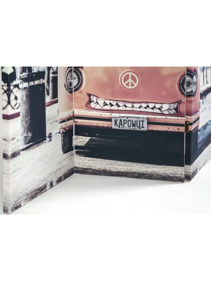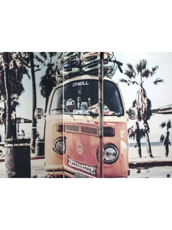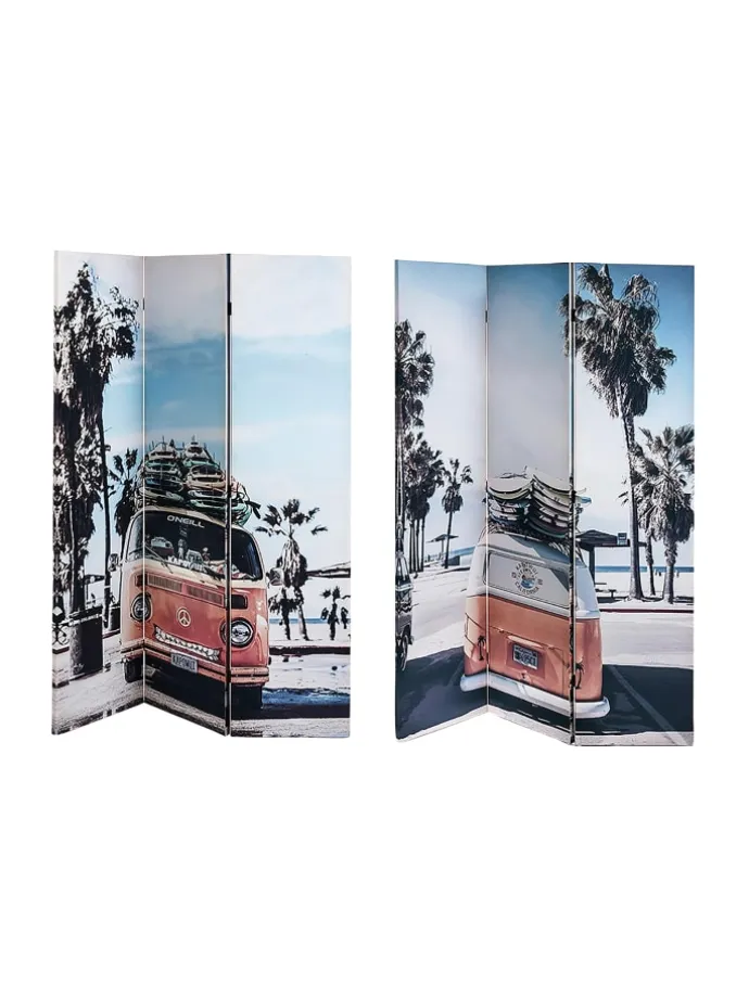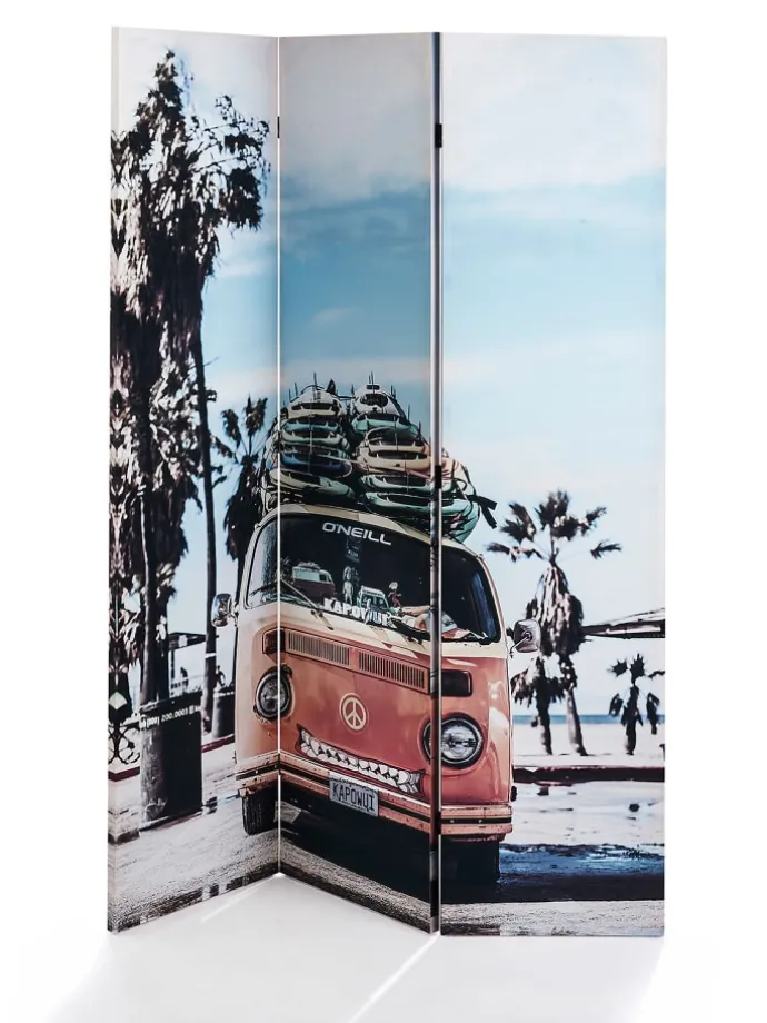 Schöner XXL Paravent mit modernem beidseitigem Retro California-Print von Kobolo. Dieser Sichtschutz kann perfekt als Raumteiler oder Dekoobjekt verwendet werden, da er blickdicht und beidseitig bedruckt ist. Mit diesem Paravent schaffen Sie einen absoluten Blickfang in Ihrem Zuhause oder Ihren Geschäftsräumen und werten jeden Einrichtungsstil gekonnt auf, durch die zwei verschiedenen Muster auf den jeweiligen Seiten können Sie jederzeit mit wenig Aufwand Ihre Wohnung durch drehen des Paravents umdekorieren. Unsere XXL Raumtrenner sind komplett fertig montiert und müssen nur in Ihrer Wohnung aufgestellt werden, durch den Rahmen aus Naturholz und den Scharnieren aus Metall ist der Paravent stabil aber gleichzeitig beweglich und kann sich den Gegebenheiten im Raum anpassen.