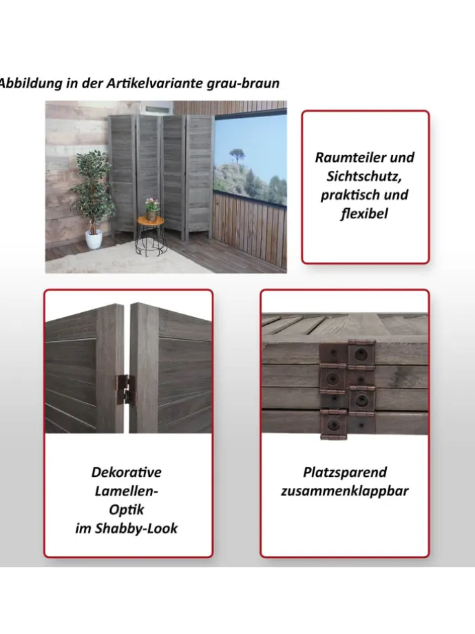 – Dieser Raumteiler im Shabby-Look ist multifunktional. Er eignet sich hervorragend als Trennwand, Sichtschutz, Sonnenschutz oder sogar als Windschutz. Durch Zusammenklappen lässt sich diese Sichtschutzwand ganz einfach und schnell platzsparend verstauen.
