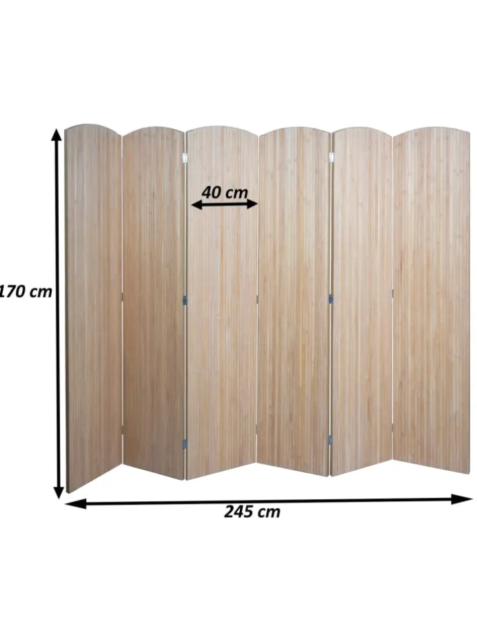 Der stilvolle Paravent mit sechs Paneelen aus hochwertigem Bambus vereint natürliche Eleganz mit praktischer Funktionalität und bringt ein warmes, harmonisches Wohngefühl in jeden Raum. Ob als dekorativer Raumteiler, flexibler Sichtschutz oder als ästhetisches Highlight – dieser Paravent setzt gezielte Akzente und schafft zugleich Privatsphäre, ohne dabei erdrückend zu wirken. Die feine Bambusstruktur verleiht dem Raum eine ruhige, organische Atmosphäre und sorgt durch das durchlässige Design für eine angenehme Lichtverteilung. Besonders in kleinen Wohnbereichen erweist sich der Paravent als intelligenter Helfer, denn er trennt Wohnzonen klar voneinander ab und lässt den Raum dabei optisch größer wirken – ideal für Studio-Apartments, Schlafbereiche, Büros oder Home-Office-Lösungen. Dank der klappbaren Konstruktion lässt sich der Paravent bei Bedarf platzsparend zusammenfalten und schnell verstauen, ohne auf Stil verzichten zu müssen. Die vier beweglich verbundenen Elemente ermöglichen maximale Flexibilität in der Positionierung – gerade, gewinkelt oder leicht gebogen. Ein weiterer Vorteil: Der Paravent wird komplett fertig montiert geliefert, sodass kein zeitaufwendiger Aufbau nötig ist. Einfach ausklappen und sofort nutzen. Dieses funktionale Designobjekt überzeugt durch seine hochwertige Verarbeitung, die Langlebigkeit des Materials und seine vielseitigen Einsatzmöglichkeiten – ob im Schlafzimmer, Wohnzimmer, Büro oder auch in gewerblichen Räumen wie Praxen oder Studios. Der Bambus-Paravent ist die perfekte Kombination aus Natürlichkeit, Komfort und Stil und eine kluge Wahl für alle, die Räume neu denken möchten, ohne bauliche Veränderungen vorzunehmen.