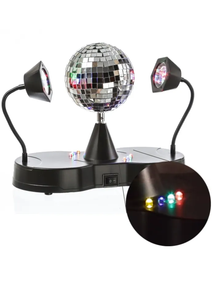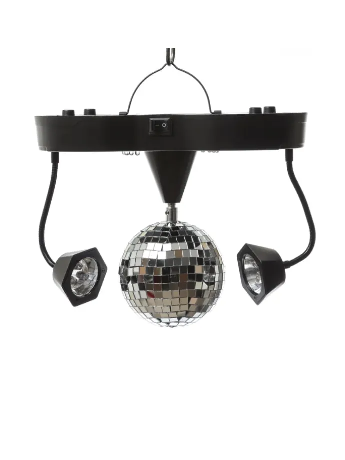 Disco Party Effekt mit Spiegelkugel mit Motor und 2 biegsamen Schwanenhals Spots Länge:: 26,5cm Breite: 13cm Höhe: 22cm Durchmesser Spiegelkugel: 10cm In den Spots verbaute LED: Rot, Grün, Blau high power 10mm LED (jeweils 3 Stück pro Spot) In der Basis verbaute LED: Rot, Grün, Blau, Gelb (jeweils 2 Stück) Kabelfarbe: Schwarz Kabellänge: 1m Stromversorgung: 3x AA Mignon Batterien -nicht im Lieferumfang enthalten Betrieb auch per USB C Kabel – im Lieferumfang enthalten USB Netzteil – nicht im Lieferumfang enthalten Inkl. im Boden eingeklapptem Aufhängebügel Betrieb stehend oder hängendVID:29085Sicherheitshinweise:https://media.h4g-gmbh.de/GPSR/GPSR_000036.pdfSicherheitsdatenblatt (sofern vorhanden);Gebrauchsanleitung: