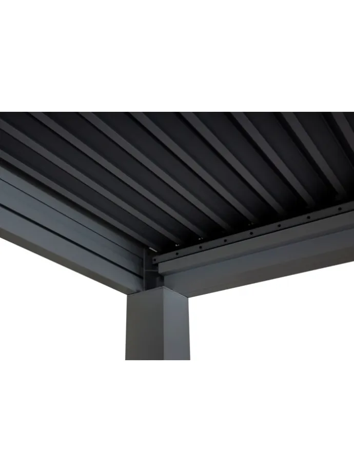 Dieser schöne Garten Lamellen-Pavillon ist mit einem Dach aus drehbaren Lamellen ausgestattet. Durch die Verwendung von drehbaren Lamellen kann das Sonnenlicht individuell angepasst werden, um ein perfektes Schatten- und Lichtverhältnis zu schaffen. Mithilfe einer Kurbel können die Lamellen einfach und schnell manuell eingestellt werden. Die Pergola ist mit einer integrierten wasserdichten Regenrinne ausgestattet, die dafür sorgt, dass das Wasser bei Regen problemlos ablaufen kann. Das stabile Gestell gewährleistet eine hohe Windresistenz von bis zu 100 km/h und verleiht dem Pavillon eine robuste Struktur. Dieser Gartenpavillon bietet somit nicht nur eine stilvolle Optik, sondern auch eine hohe Funktionalität und Widerstandsfähigkeit. Die perfekte Wahl für alle, die ihre Zeit im Freien genießen möchten und dabei nicht auf Komfort und Qualität verzichten wollen. Die Pergola ist in der Mitte höher, somit kann das Wasser zu den Seiten abfließen.