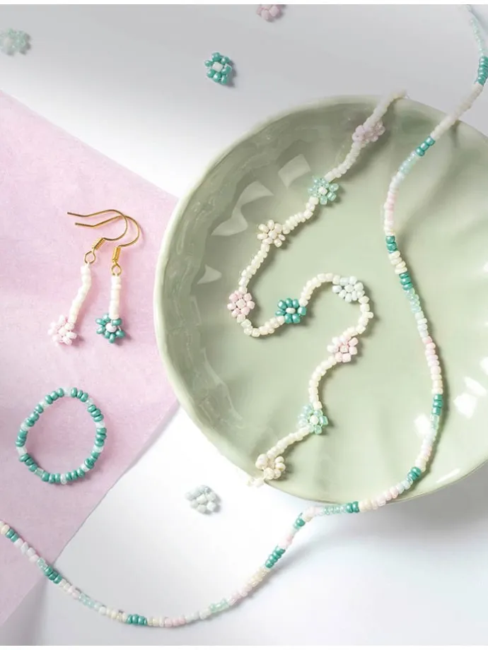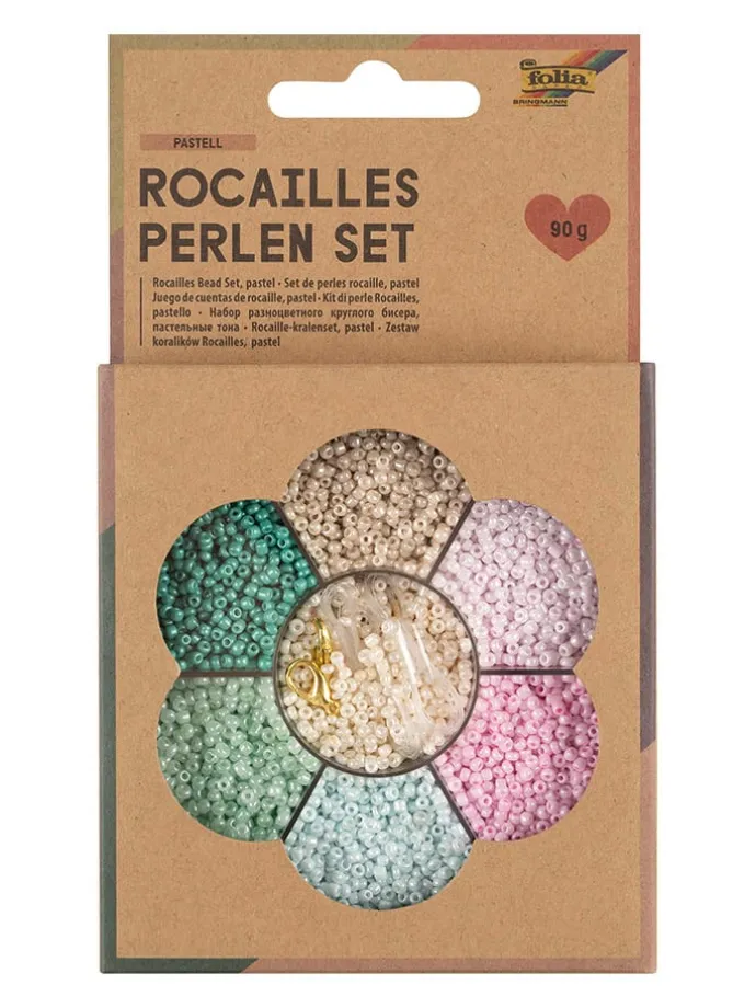 – Inhalt: Rocailles-Perlen in verschiedenen Farben, 3 Nylonfaden, 3 Ringel & Verschlüsse