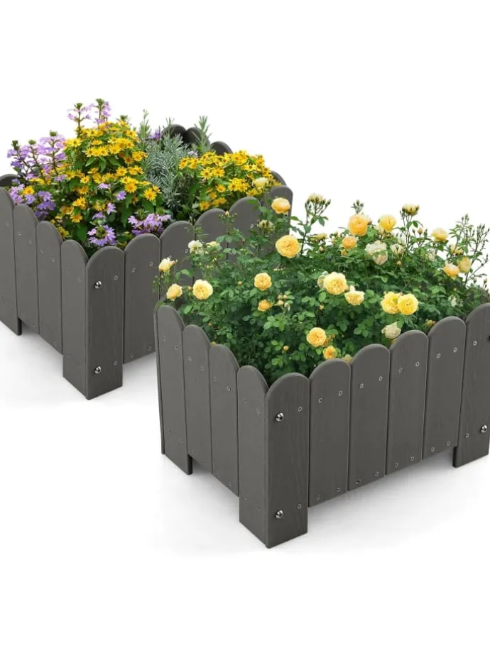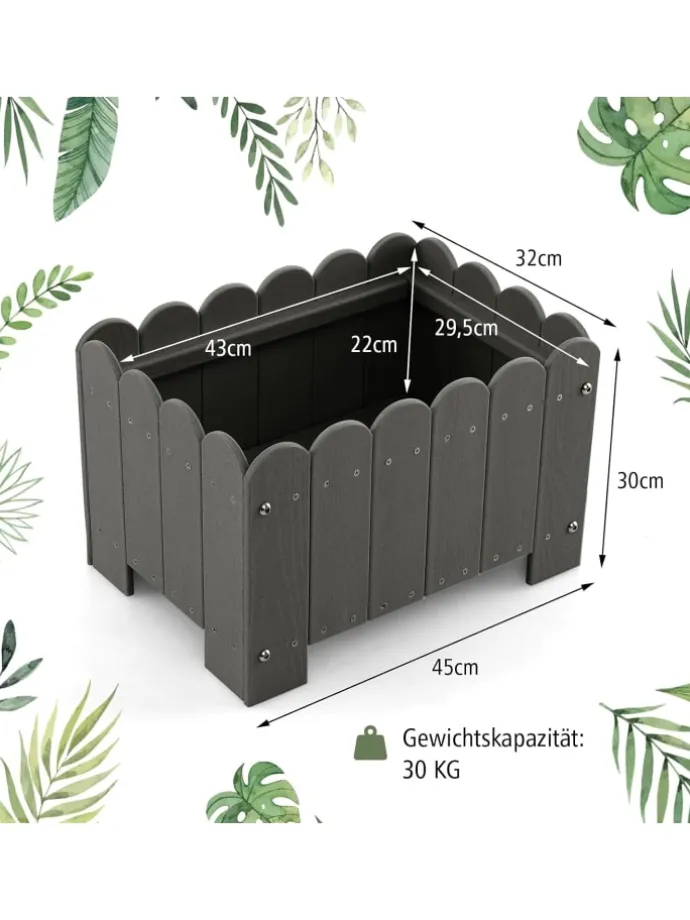 Die Kunststoff-Pflanzkästen für den Außenbereich werden Ihrer Fantasie freien Lauf lassen und eignen sich perfekt für die Präsentation Ihrer Lieblingspflanzen, Blumen und Kräuter. Diese aus hochwertigem HDPE gefertigten Pflanzkästen sind so konstruiert, dass sie den Witterungseinflüssen im Freien standhalten, was sie zu einer zuverlässigen Wahl für Ihre Gartenarbeit macht. Jedes Set enthält 2 Pflanzkästen, sodass Sie eine perfekt abgestimmte Anordnung erstellen können. Die simulierte Holzmaserung und das Zaundesign ergänzen jede Außenumgebung und sorgen für einen rustikalen und dennoch eleganten Look.