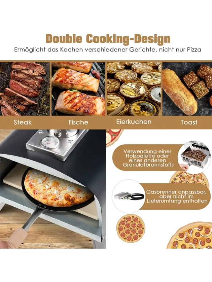 Dieser Outdoor-Pizzaofen ist mit Holzpaletten, Holzkohle oder Gasbrennern kompatibel (Brennstoff und Brenner sind nicht im Lieferumfang enthalten). Die Holzkiste und der Fülltrichter ermöglichen das Hinzufügen und Nachfüllen des Heizmaterials. Sobald das brennende Material drin ist, benötigt dieser Outdoor-Pizzaofen nur 5 Minuten zum Aufheizen. Er kann auf bis zu 232 °C erhitzen und backt Ihre Pizza in nur 30 bis 40 Sekunden perfekt. Unser Outdoor-Pizzaofen kann Ihren Fisch-, Steak- und Gemüsegerichten einen holzbefeuerten und rauchigen Stil verleihen. Und das eingebaute Thermometer zeigt Ihnen die Temperatur in Echtzeit an und hilft Ihnen, im richtigen Temperatur zu kochen.