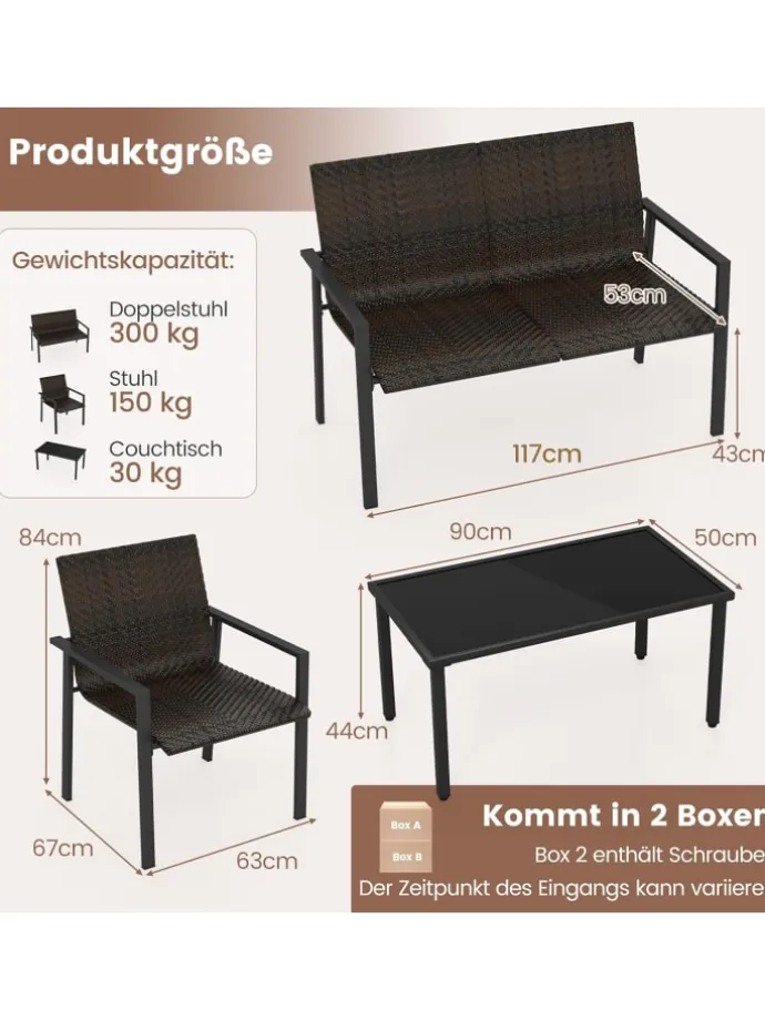 Material: Metall, PE-Rattan, gehärtetes Glas