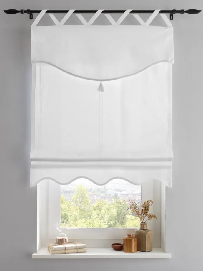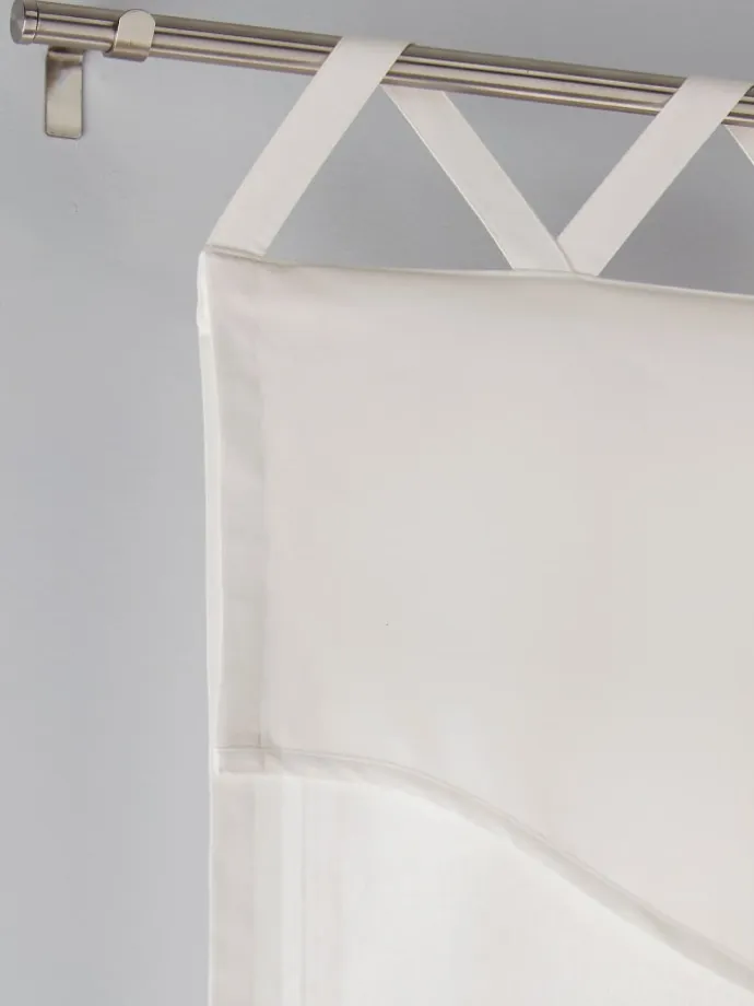 Raffrollo Blickdichte Qualität. Mit dekorativen Kreuzschlaufen zur Aufhängung an der Gardinenstange. Latz mit fixierter Quaste und gewelltem Abschluss. Beschwerungsstange oben und unten. Tipps zum richtigen Maßnehmen online. Unterstützt die Initiative Cotton made in Africa.