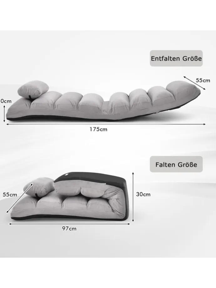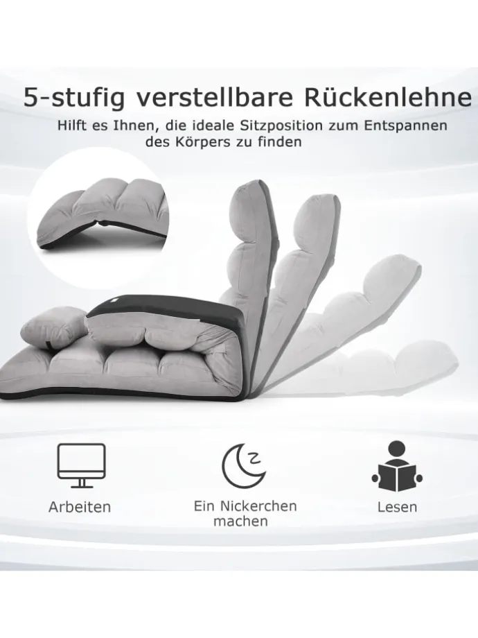 Suchen Sie noch nach einem praktischen Sofa? Diese Bodenliege wird Ihnen mit Sicherheit gefallen. Mit ihrer 5-fach verstellbaren Rückenlehne kann sie für verschiedenste Zwecke verwendet werden, beispielsweise beim Fernsehen zum Sitzen oder nachts zum Schlafen. Dabei werden Sie optimal gestützt. Durch die Kombination von dickem Schaumstoff und weichem Bezug ist ein hoher Komfort garantiert. Die Bodenliege wird verschiedenste Bedürfnisse erfüllen.