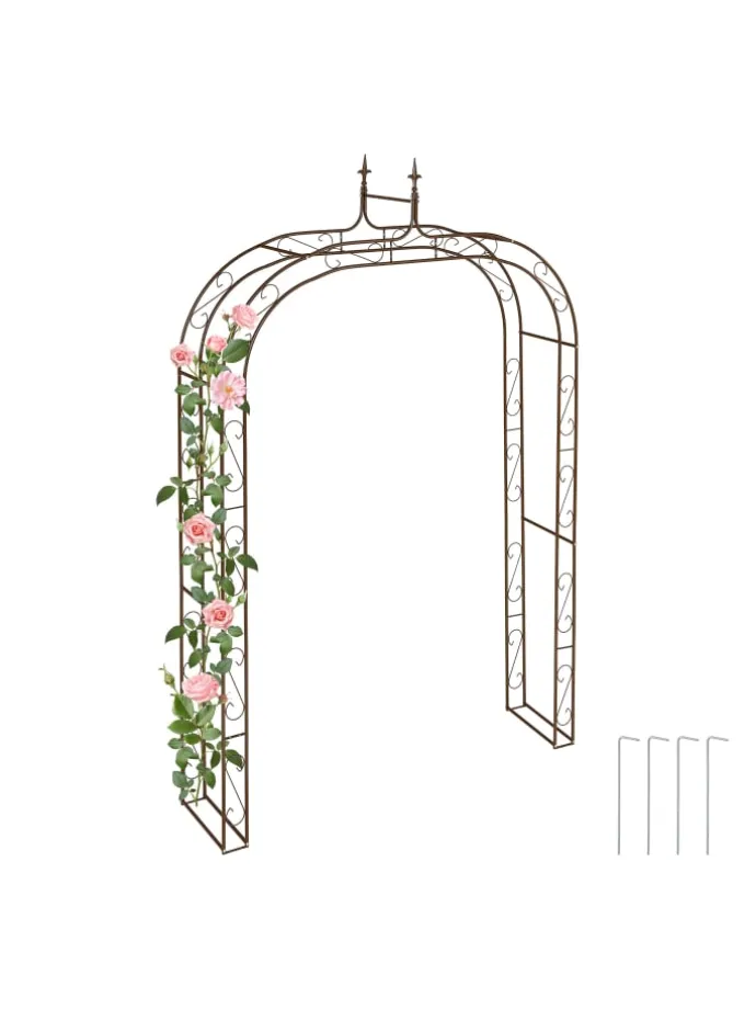 Dieser braune Blumenbogen aus Metall gibt nicht nur Kletterpflanzen den nötigen Halt beim Wachsen und Ranken, sondern trägt auch zu einer dekorativen Gartengestaltung bei. Zier- und Nutzpflanzen wie Efeu, Rosen, Clematis oder Wein werden mit dem Gartenbogen gekonnt in Szene gesetzt. Die zierenden Ornamente und Spitzen sorgen dabei für romantisches Flair. Mit den beiliegenden Heringen kannst Du den wetterfesten Torbogen für sicheren Halt ganz einfach im Boden verankern.