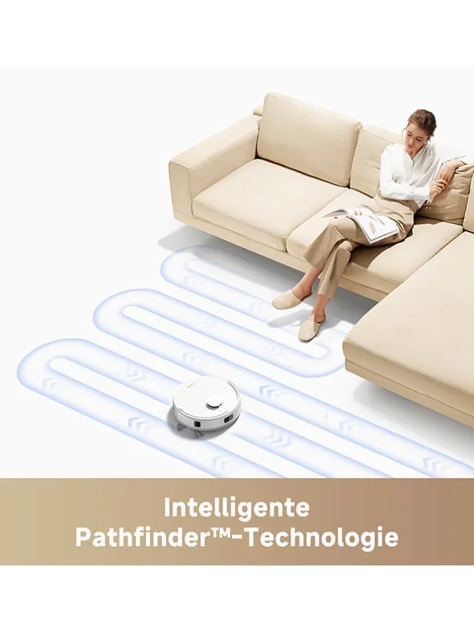– präzise Navigation mit LDS-Laser (LiDAR): kartografiert Räumlichkeiten exakt und schafft effiziente Reinigungsrouten