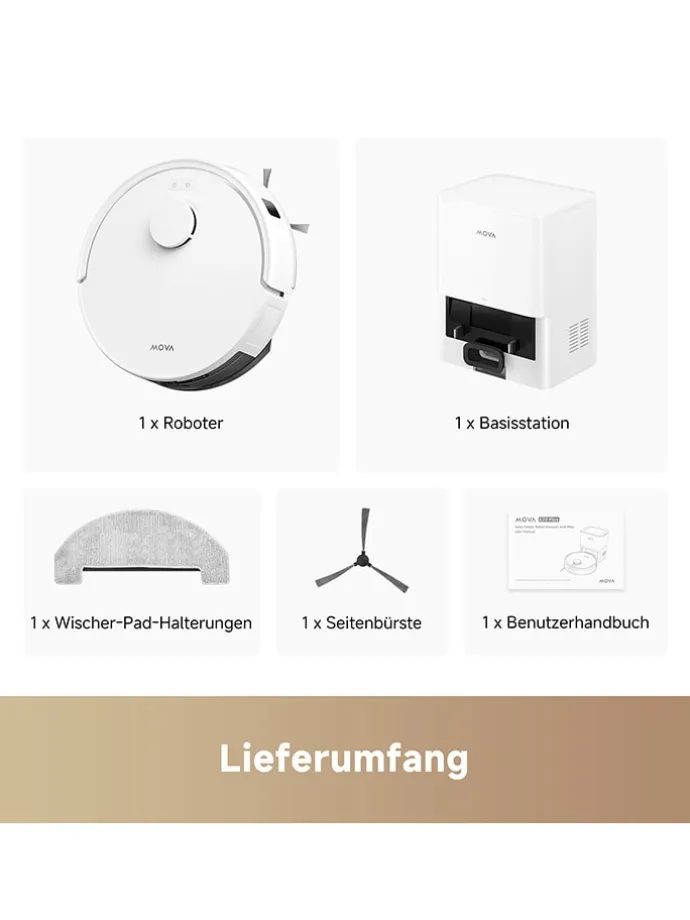 1x Saugroboter, 1x automatische Entleerungsstation inkl. Beutel (4 l), 1x Ladestation, 1x seitliche Bürste, 1x Mop-Aufsatz
