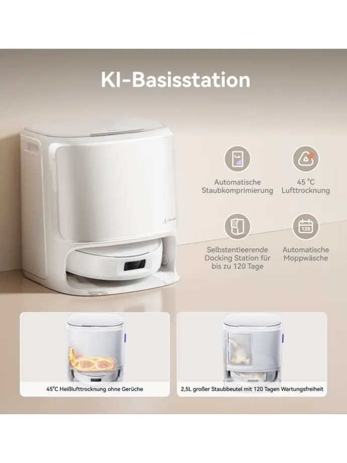 Die hochintelligente KI-Basisstation arbeitet bis zu 120 Tage wartungsfrei. Sie entleert den Staubbehälter automatisch, komprimiert den Staub, wäscht und trocknet die Mopp-Pads hygienisch bei bis zu 45°C. So genießen Sie maximale Hygiene und Komfort ohne Aufwand. Der Roboter navigiert präzise und sicher durch Ihre Räume und meistert Hindernisse mühelos.