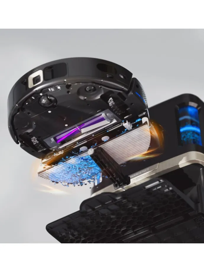 Der Roboter hebt und senkt sich aktiv dank der NeverStuck-Technologie, um über Hindernisse und Bodenschwellen zu manövrieren und ein Hängenbleiben zu vermeiden. Perfekt für Haustierbesitzer mit der selbstreinigenden Anti-Hair-Wrap-Bürstenrolle, der Anti-Allergen-Komplettversiegelung in der Basisstation und der Anti-Odour-Technologie für ein frischer riechendes Zuhause.