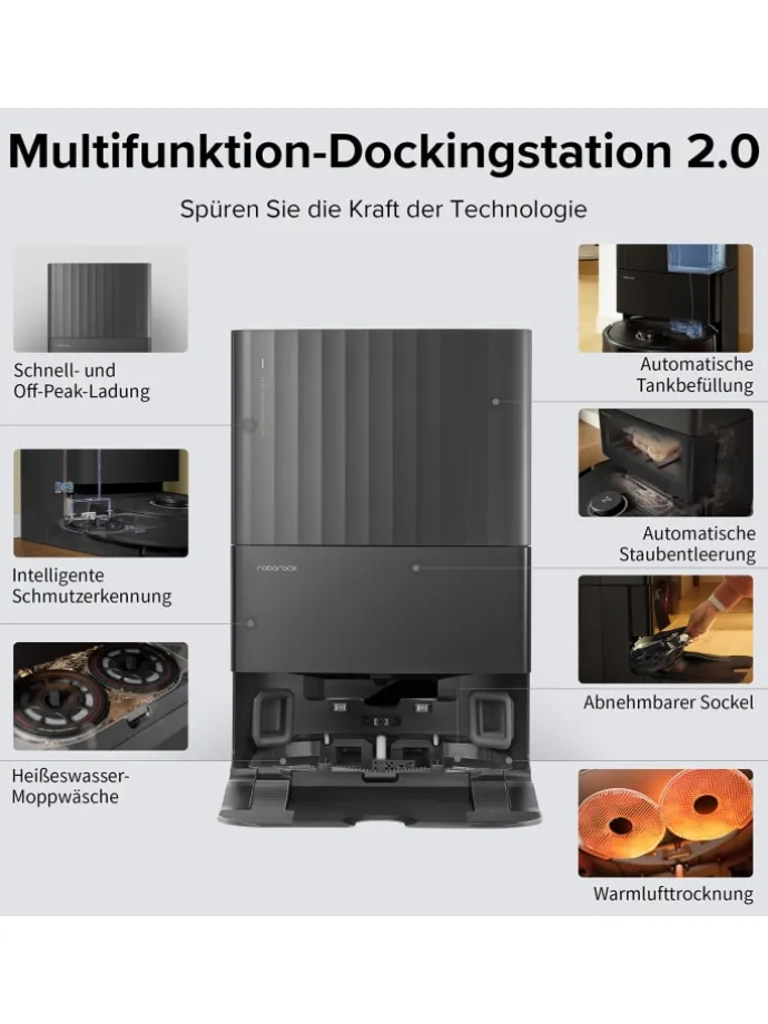 All-in-One Dock : Die selbstreinigende RockDock Ultra bietet zusätzlichen Komfort für eine mühelose Raumreinigung: Dank intelligenter automatischer Funktionen wie Heißwasser-Moppwäsche mit Temperaturen von bis zu 60°C, vollständigem hygienischen Heißlufttrocknen des Mopps und der Dockingstation sowie der unabhängigen Dosierung von Reinigungsmitteln und einer abnehmbaren Dockingstation bleibt der Wartungsaufwand für Ihren Roborock Qrevo Pro auf ein absolutes Minimum reduziert.