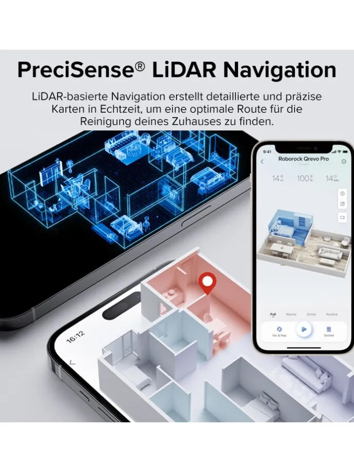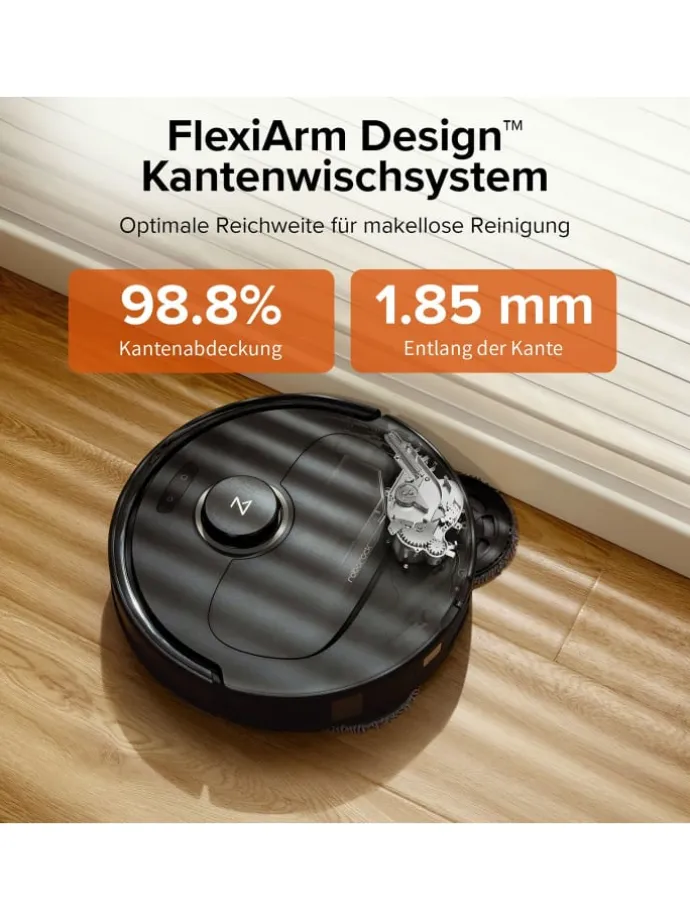 98,8% Abdeckung für Ecken- und Kantenreinigung: Mit dem FlexiArm-Design erreicht der Roborock Qrevo Pro die Ränder des Saugroboters, um eine gründliche Reinigung der Kanten sicherzustellen. Der Abstand zur Kantenreinigung beträgt nur 1,85 mm.
