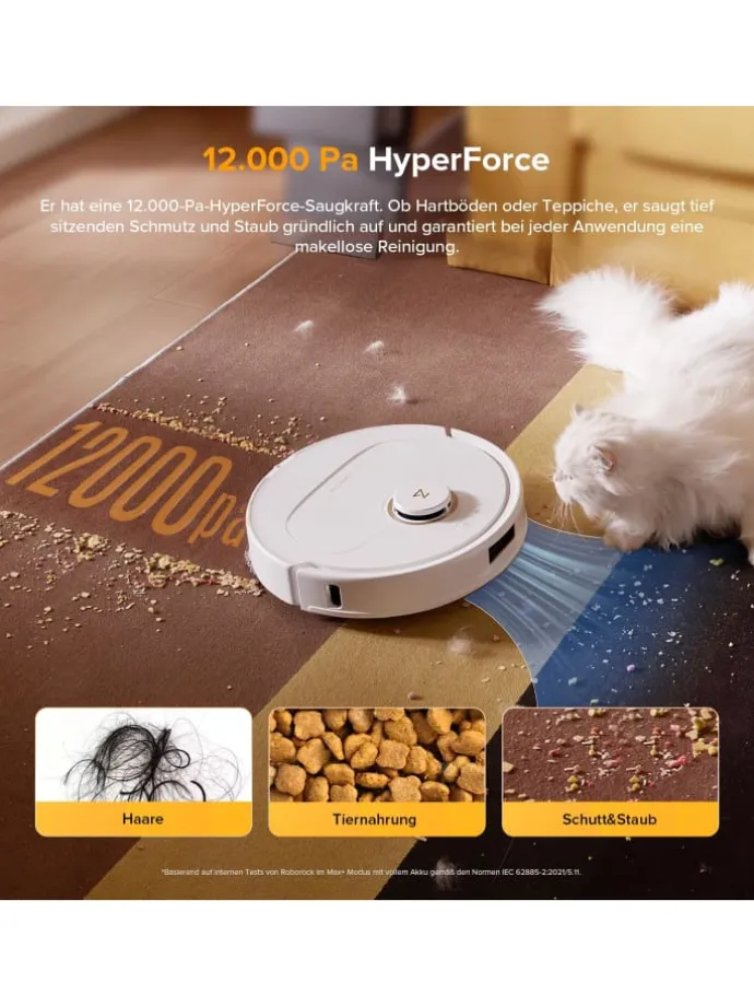 HyperForce Reinigungsleistung: 12.000 Pa Saugkraft + 10% höhere Bürstendrehzahl im Max-Modus.