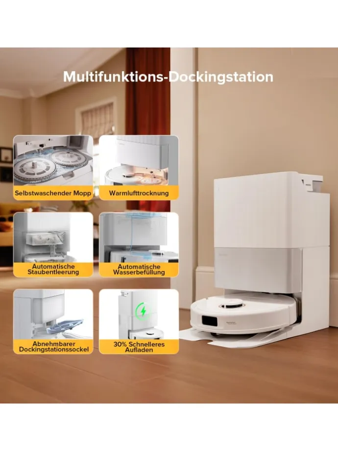 Multifunktions-Dockingstation: Diese vollautomatisierte Dockingstation übernimmt Entleerung und Reinigung, sodass Sie sich auf Wesentliches konzentrieren können.