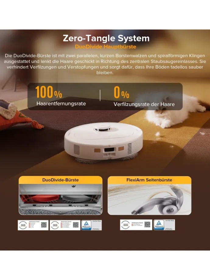 Sauberkeit ohne Hindernisse: 100% Haar-Entfernungsrate durch innovatives Bürstensystem.
