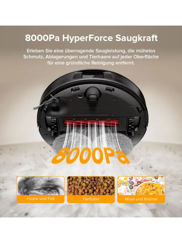 -8000Pa Hochleistungssaugkraft : Entfernt tief sitzenden Schmutz in Teppichen, Ritzen und Ecken – selbst hartnäckige Verschmutzungen und Tierhaare bleiben keine Chance.