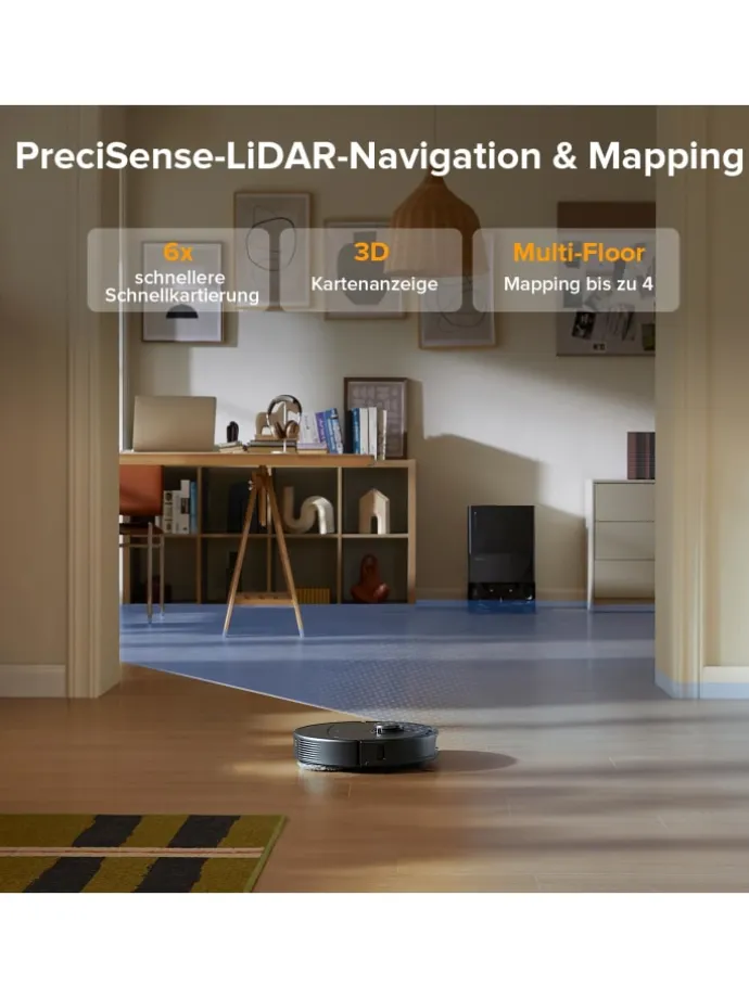-LiDAR 4D-Navigation: 360°-Echtzeitscan mit 4-Etagen-Speicher. 80% effizientere Routenplanung für lückenlose Reinigungsergebnisse.