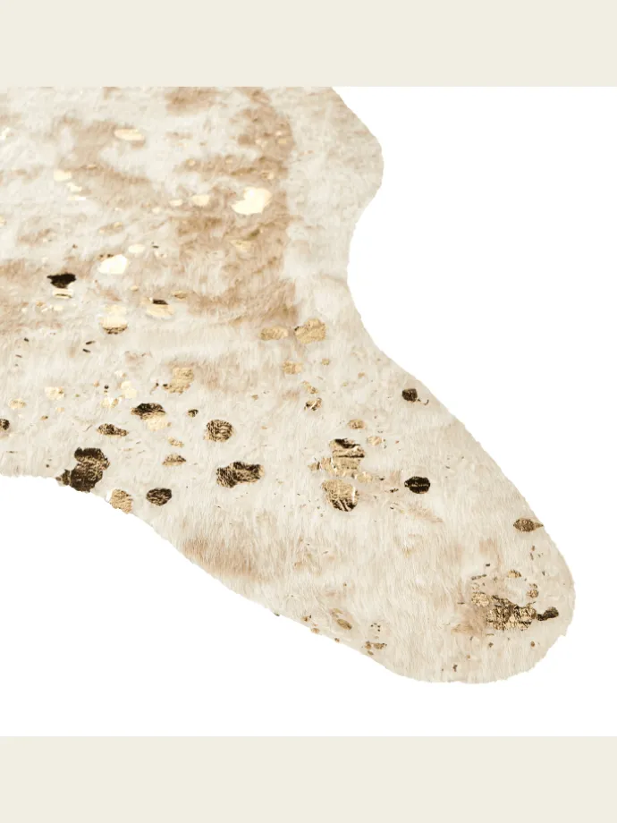 Künstliches Rindsleder mit goldfarbenen Akzenten. Schaffen Sie einen rustikalen Akzent in Ihrem Wohnzimmer, Flur oder Arbeitszimmer mit diesem wunderschönen Teppich aus Kuhfellimitat. Er ist aus einer Mischung aus Acryl und Polyester gefertigt und hat einen weichen Flor, der mit glänzenden, goldenen Verzierungen versehen ist, die ihm einen glamourösen Touch verleihen. Die strapazierfähige Rückseite des Teppichs sorgt für zusätzliche Langlebigkeit und Festigkeit. Ob in einer modernen, traditionellen oder retro-inspirierten Einrichtung, dieser Teppich ist ein echter Hingucker.