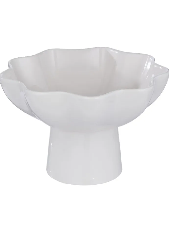 Hell und gewellt: Die Louise Schale mit Fuß in Creme erweist sich als zeitloser und verspielter Allrounder zum Dekorieren, Servieren und Tisch decken. So kannst du die Schale aus Steinzeug z.B. mit Gebäck auf der Kaffeetafel oder pur als Blickfang auf einem Beistelltisch platzieren.