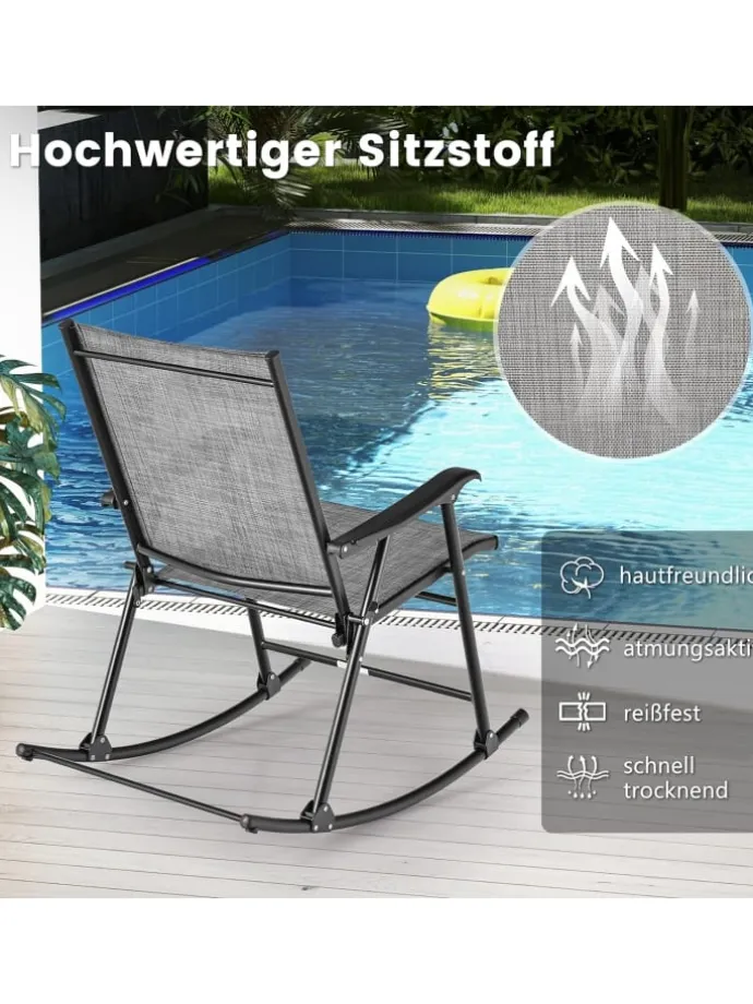 Mit atmungsaktivem Sitzstoff und stabilem Metallrahmen bieten diese Stühle Komfort und Langlebigkeit. Sie bieten eine sanfte Schaukelbewegung für bessere Entspannung. Der untere Stopper gewährleistet hohe Sicherheit beim Schaukeln. Zusätzlich ermöglicht das schnelle Klappdesign eine einfache Lagerung und Transportierbarkeit. Genießen Sie die Entspannung im Freien mit diesem robusten Schaukelstuhl-Set, das Stil und Bequemlichkeit vereint!