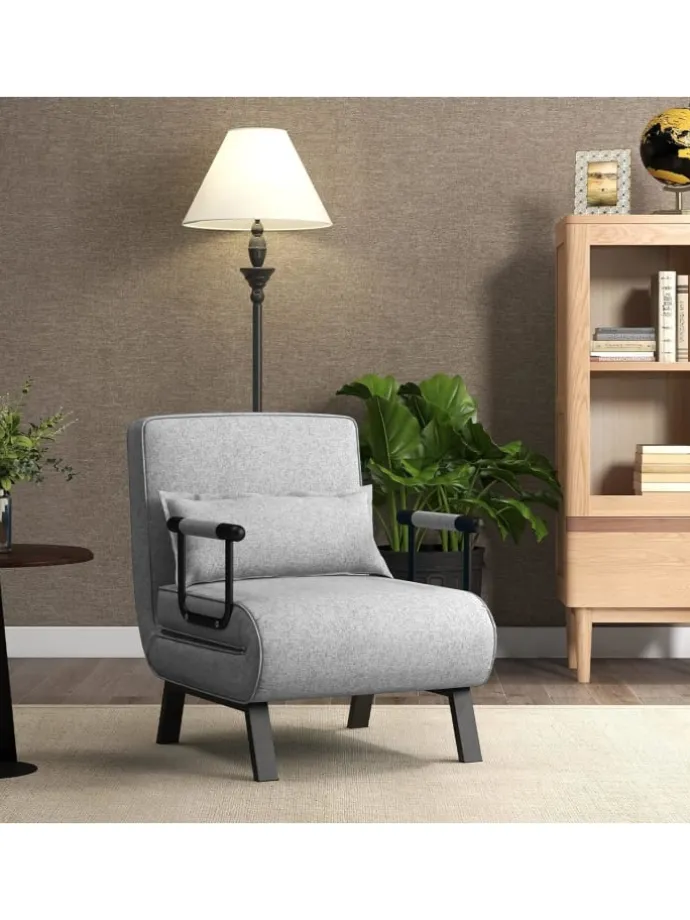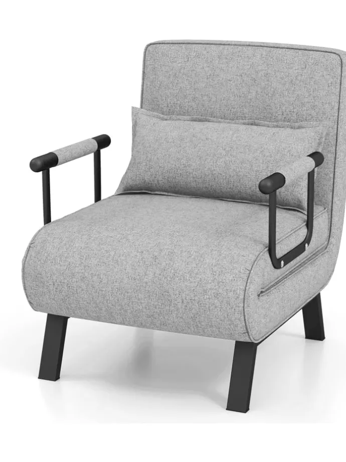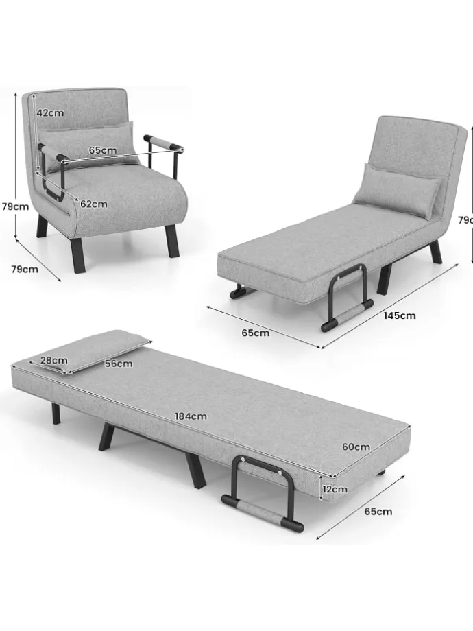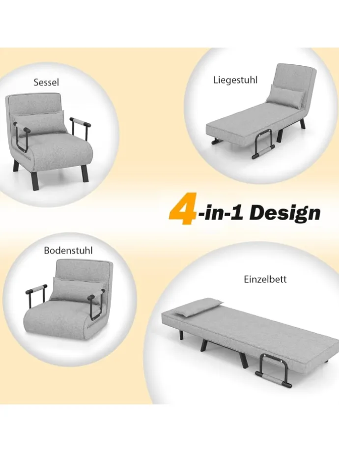 Dieser Schlafsessel ist die ideale Wahl für Sie oder Ihre Familie. Er kann als Bett, Sofasessel und Liege verwendet werden, was alle Ihre Sitz- oder Schlafbedürfnisse erfüllt. Der Sitz ist aus hochwertigem Leinenstoff und elastischem Schwamm für ein angenehmes Sitzerlebnis. Außerdem sorgt das weiche Kissen für mehr Komfort. Sie können Ihre Arme auch zum Entspannen auf die Armlehnen legen. Außerdem ist der abnehmbare Kissenbezug leicht zu reinigen. Abgesehen davon wird das Schlafsofa von Metallbeinen getragen, die stark genug sind, um eine hohe Tragfähigkeit zu tragen. Darüber hinaus können die klappbaren, versteckten Beine bei Nichtgebrauch in der Rückenlehne verstaut werden.