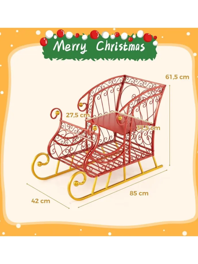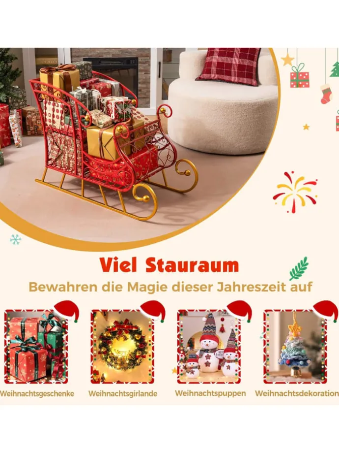 Dieser vielseitige Weihnachtsschlitten ist mehr als nur Dekoration: Er wird Teil der Familientradition. Ein Aufbewahrungsschlitten, unzählige Weihnachtsmomente: Verleihen Sie jedem Raum festlichen Charme mit dem Weihnachtsmannschlitten, einem atemberaubenden Weihnachtsdekor mit einem leuchtend roten Rahmen und einem schimmernden goldenen Sockel. Dieser Metallschlitten bietet ein geräumiges 2-stöckiges Design, perfekt zum Präsentieren von Geschenken, Ornamenten und wertvollen Erinnerungsstücken. Seine stabile Bauweise garantiert, dass er Jahr für Jahr ein wunderschönes saisonales Highlight bleibt und gemütliche Wohnräume, lebhafte Büros, Schulen, Geschäfte und Festveranstaltungen gleichermaßen ergänzt.