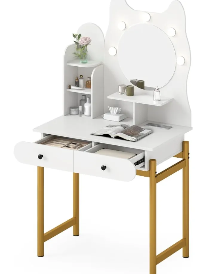 Der Schminktisch verfügt über einen beleuchteten Spiegel, der Ihre Makeup-Routine angenehmer gestaltet. Er ist mit 1 Tischplatte, 2 Schubladen und 3 offenen Regalen ausgestattet, um Kosmetik, Haartrockner, Schmuck und Beauty-Tools aufzubewahren. Besonders praktisch sind die 3 Ladeoptionen: 2 AC-Steckdosen, 1 Typ-C- und 1 USB-Anschluss, die Ihren Ladebedürfnissen entsprechen. Die stabilen Metallbeine und das Anti-Kipp-Design bieten hohe Stabilität. Die Anti-Rutsch-Füße schützen zusätzlich den Boden vor Kratzern. Mit den Maßen 80 x 50 x 150 cm bietet der Schminktisch zusätzlichen Platz zum Schminken, ohne zu viel Raum einzunehmen.