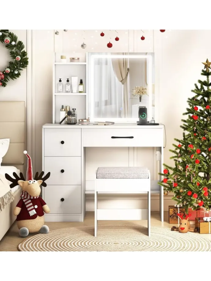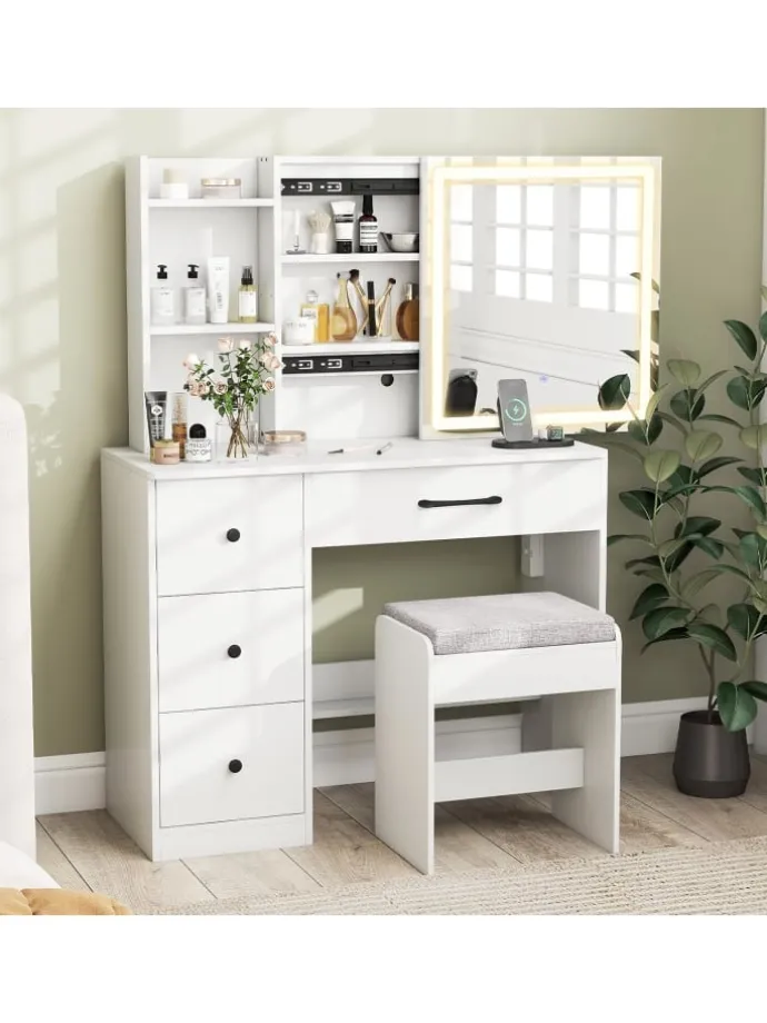 Das Schminktisch-Set mit Schiebespiegel und Beleuchtung ist eine perfekte Ergänzung für Ihr Schlafzimmer. Der beleuchtete Schiebespiegel ermöglicht es, Kleinteile praktisch zu verstecken und dennoch schnell zu erreichen. 3 Lichtmodi und einstellbare Helligkeit erlauben es Ihnen, Ihr Make-up individuell zu gestalten. Darüber hinaus verfügt der Frisiertisch über 1 Spiegelschrank mit Regalen, 1 große Schublade, 1 unteres Regal, 2 offene Regale und 3 tiefe Schubladen zur Aufbewahrung verschiedenartiger Gegenstände. Das 3-stufig verstellbare Regal lässt sich für unterschiedliche Höhen anpassen. Eine Ladestation sorgt für die Stromversorgung von Handy und Tablet. Verbreiterte Beine und das Kippschutzdesign gewährleisten Standfestigkeit und verhindern Wackeln.