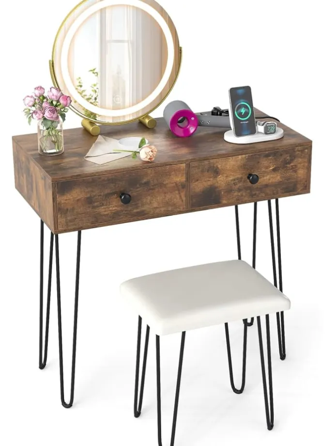 Erleben Sie personalisierte Beauty-Routinen mit diesem Schminktisch- und Hocker-Set! Der enthaltene Schminkspiegel bietet 3 Farbbeleuchtungsmodi und einstellbare Helligkeit. Die 360°-freie Spiegelrotation ermöglicht es Ihnen, jedes Mal den perfekten Winkel zu finden. Ausgestattet mit eingebauten Steckdosen können Sie Ihr Telefon, Tablet oder Stylinggeräte bequem aufladen, während Sie sich fertig machen. Zudem können Sie mit der großzügigen Tischplatte und 2 Schubladen Ihren Bereich ordentlich halten.
